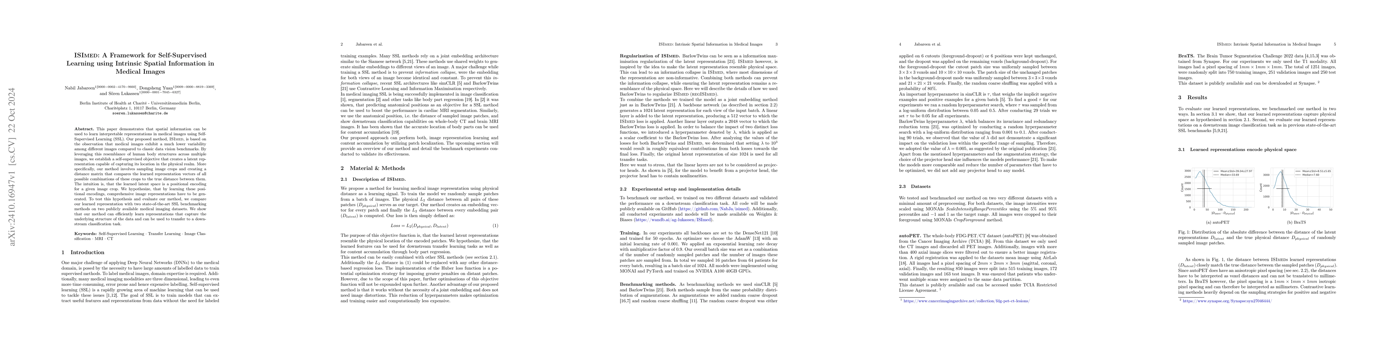 This paper demonstrates that spatial information can be used to learn interpretable representations in medical images using Self-Supervised Learning (SSL). Our proposed method, ISImed, is based on the observation that medical images exhibit a much lower variability among different images compared to classic data vision benchmarks. By leveraging this resemblance of human body structures across multiple images, we establish a self-supervised objective that creates a latent representation capable of capturing its location in the physical realm. More specifically, our method involves sampling image crops and creating a distance matrix that compares the learned representation vectors of all possible combinations of these crops to the true distance between them. The intuition is, that the learned latent space is a positional encoding for a given image crop. We hypothesize, that by learning these positional encodings, comprehensive image representations have to be generated. To test this hypothesis and evaluate our method, we compare our learned representation with two state-of-the-art SSL benchmarking methods on two publicly available medical imaging datasets. We show that our method can efficiently learn representations that capture the underlying structure of the data and can be used to transfer to a downstream classification task.