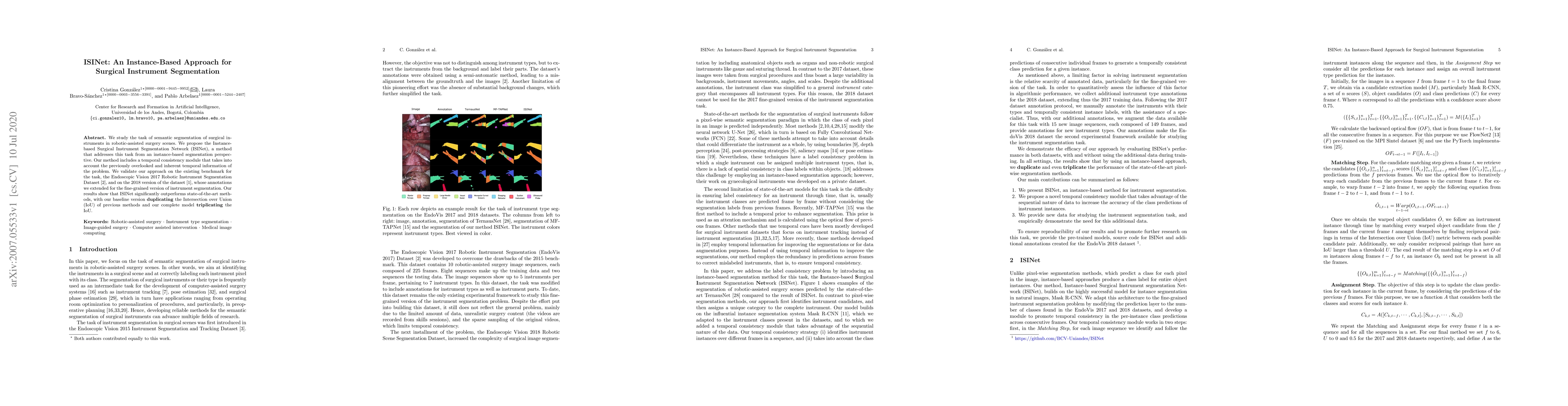 The ISINet method proposes an instance-based approach for segmenting surgical instruments in robotic-assisted surgeries, incorporating a temporal consistency module to enhance performance. It outperforms existing methods on benchmark datasets, triplicating the Intersection over Union (IoU) in its complete form.