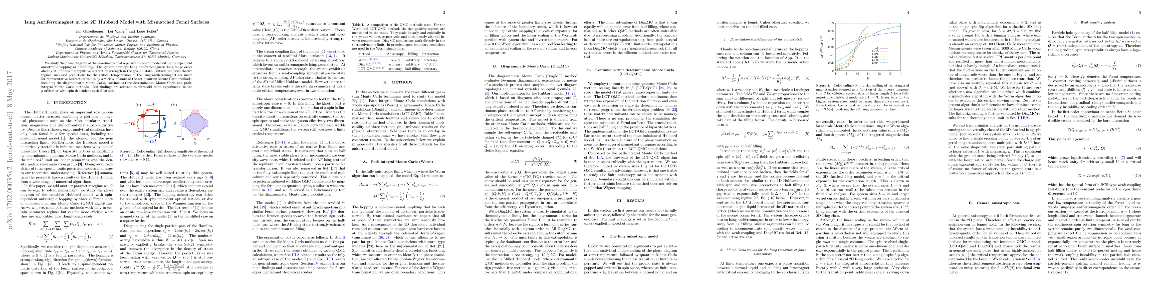 The paper investigates the 2D Hubbard model with mismatched Fermi surfaces, finding Ising antiferromagnetic long-range order develops at infinitesimal repulsive interaction strengths. Using advanced quantum Monte Carlo methods, the study provides unbiased critical temperature predictions for various interaction values, with implications for ultracold atom experiments.
