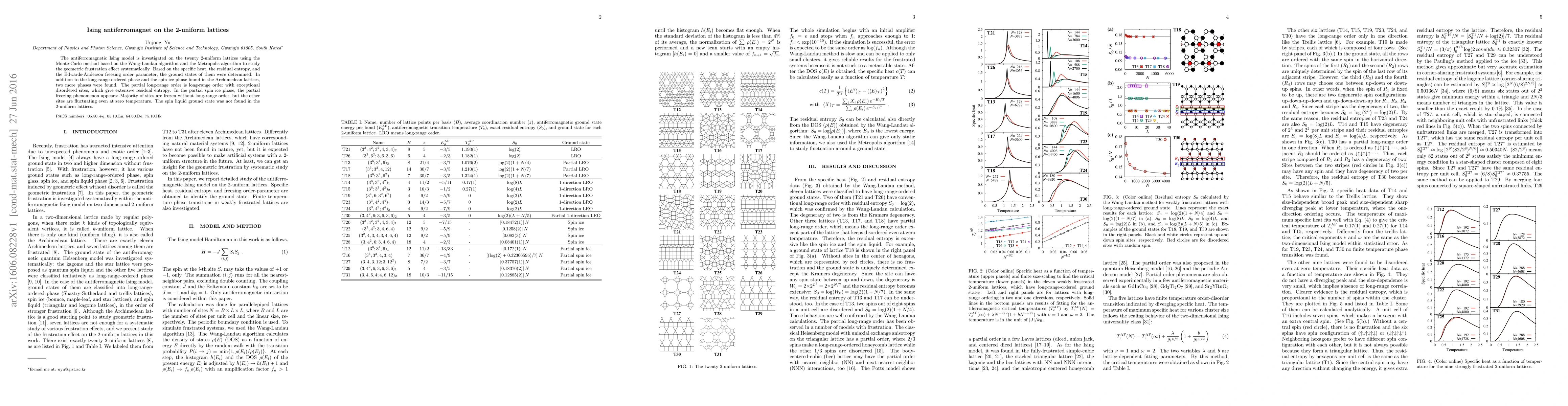 The antiferromagnetic Ising model is investigated on the 20 2-uniform lattices using the Monte-Carlo method based on the Wang-Landau algorithm and the Metropolis algorithm to study the geometric frustration effect systematically. Based on the specific heat, the residual entropy, and the Edwards-Anderson freezing order parameter, the ground states of them were determined. In addition to the long-range-ordered phase and the spin ice phase found in the Archimedean lattices, two more phases were found. The partial long-range order is long-range order with exceptional disordered sites, which gives extensive residual entropy. In the partial spin ice phase, the partial freezing phenomenon appears: Majority of sites are frozen without long-range order, but the other sites are fluctuating even at zero temperature. The spin liquid ground state was not found in the 2-uniform lattices.