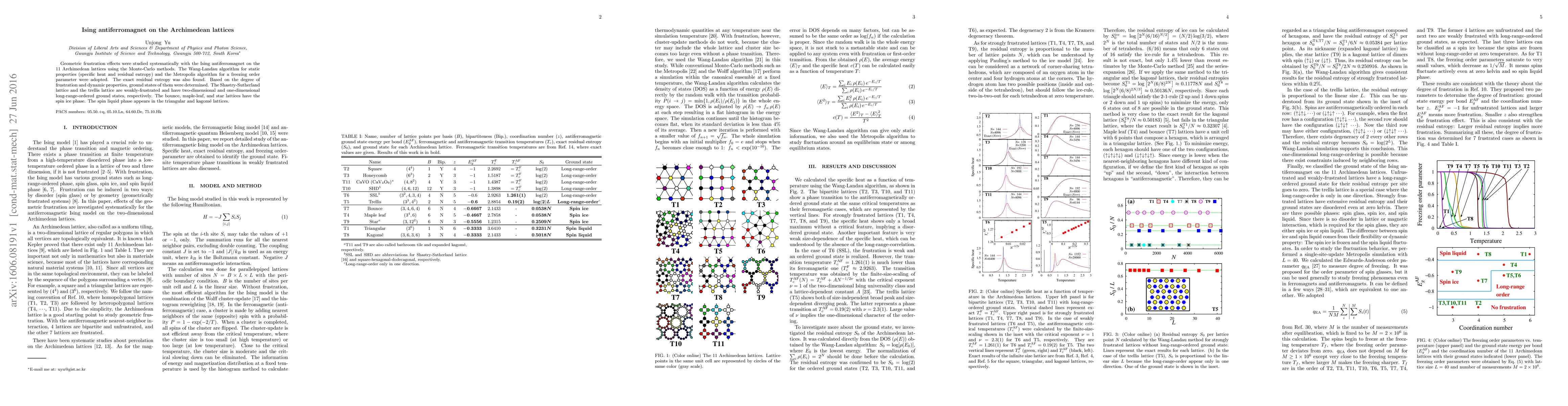 Geometric frustration effects were studied systematically with the Ising antiferromagnet on the 11 Archimedean lattices using the Monte-Carlo methods. The Wang-Landau algorithm for static properties (specific heat and residual entropy) and the Metropolis algorithm for a freezing order parameter were adopted. The exact residual entropy was also found. Based on the degree of frustration and dynamic properties, ground states of them were determined. The Shastry-Sutherland lattice and the trellis lattice are weakly-frustrated and have two-dimensional and one-dimensional long-range-ordered ground states, respectively. The bounce, maple-leaf, and star lattices have the spin ice phase. The spin liquid phase appears in the triangular and kagom\'e lattices.