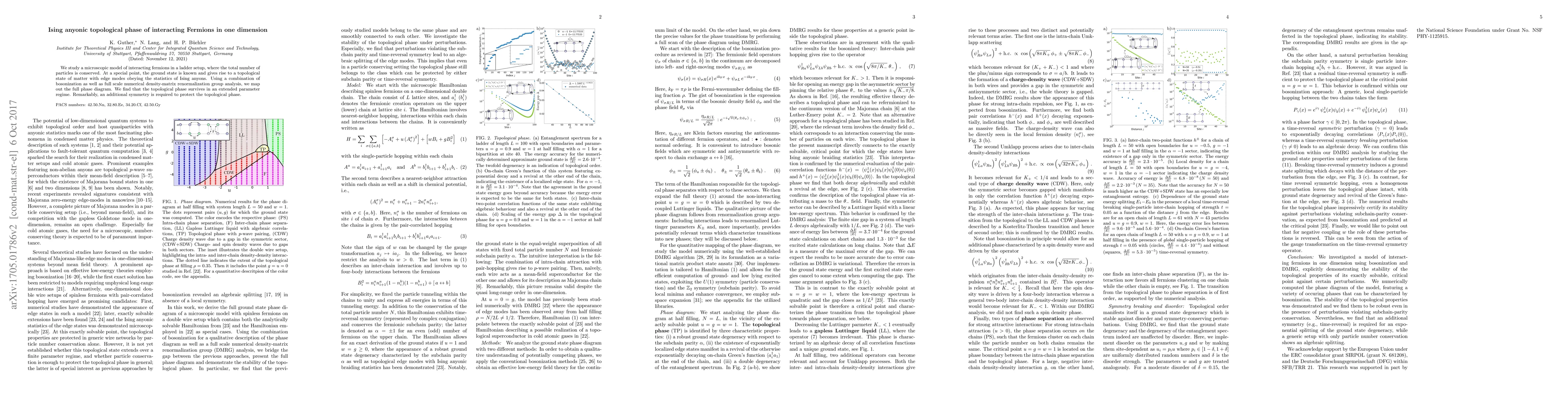 We study a microscopic model of interacting fermions in a ladder setup, where the total number of particles is conserved. At a special point, the ground state is known and gives rise to a topological state of matter with edge modes obeying the statistics of Ising anyons. Using a combination of bosonization as well as full scale numerical density-matrix renormalization group analysis, we map out the full phase diagram. We nd that the topological phase survives in an extended parameter regime. Remarkably, an additional symmetry is required to protect the topological phase.