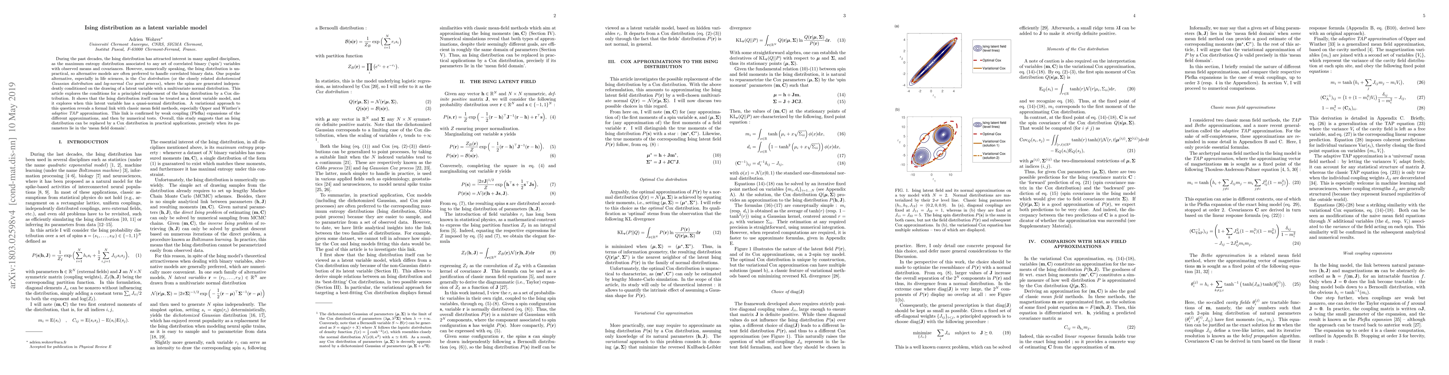 During the past decades, the Ising distribution has attracted interest in many applied disciplines, as the maximum entropy distribution associated to any set of correlated binary (`spin') variables with observed means and covariances. However, numerically speaking, the Ising distribution is unpractical, so alternative models are often preferred to handle correlated binary data. One popular alternative, especially in life sciences, is the Cox distribution (or the closely related dichotomized Gaussian distribution and log-normal Cox point process), where the spins are generated independently conditioned on the drawing of a latent variable with a multivariate normal distribution. This article explores the conditions for a principled replacement of the Ising distribution by a Cox distribution. It shows that the Ising distribution itself can be treated as a latent variable model, and it explores when this latent variable has a quasi-normal distribution. A variational approach to this question reveals a formal link with classic mean-field methods, especially Opper and Winther's adaptive TAP approximation. This link is confirmed by weak coupling (Plefka) expansions of the different approximations and then by numerical tests. Overall, this study suggests that an Ising distribution can be replaced by a Cox distribution in practical applications, precisely when its parameters lie in the `mean-field domain'.