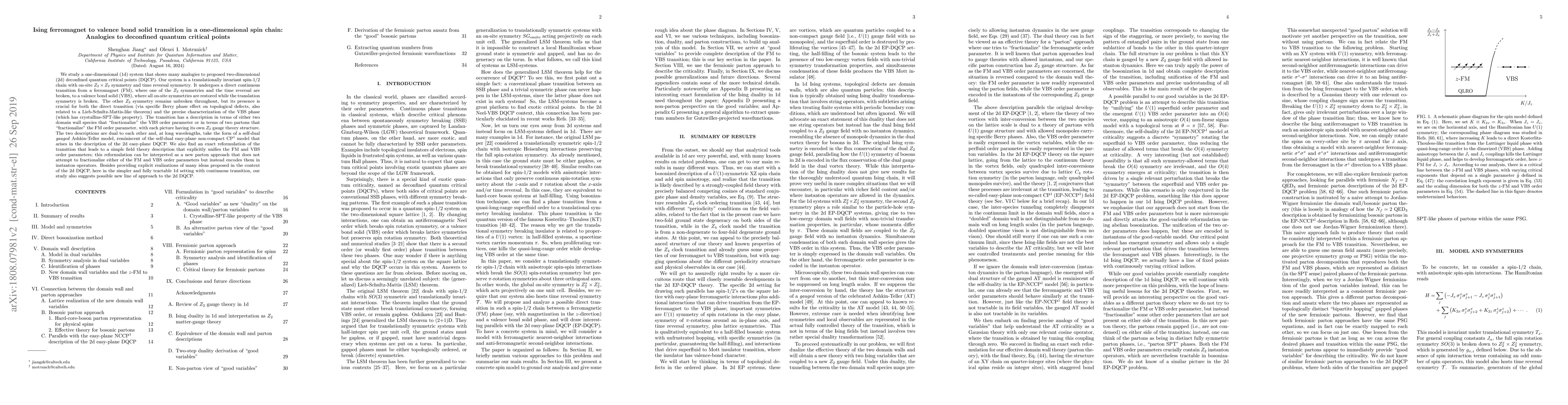 We study a one-dimensional (1d) system that shows many analogies to proposed two-dimensional (2d) deconfined quantum critical points (DQCP). Our system is a translationally invariant spin-1/2 chain with on-site $Z_2 \times Z_2$ symmetry and time reversal symmetry. It undergoes a direct continuous transition from a ferromagnet (FM), where one of the $Z_2$ symmetries and the time reversal are broken, to a valence bond solid (VBS), where all on-site symmetries are restored while the translation symmetry is broken. The other $Z_2$ symmetry remains unbroken throughout, but its presence is crucial for both the direct transition (via specific Berry phase effect on topological defects, also related to a Lieb-Schultz-Mattis-like theorem) and the precise characterization of the VBS phase (which has crystalline-SPT-like property). The transition has a description in terms of either two domain wall species that "fractionalize" the VBS order parameter or in terms of partons that "fractionalize" the FM order parameter, with each picture having its own $Z_2$ gauge structure. The two descriptions are dual to each other and, at long wavelengths, take the form of a self-dual \emph{gauged} Ashkin-Teller model, reminiscent of the self-dual easy-plane non-compact CP$^1$ model that arises in the description of the 2d easy-plane DQCP. We also find an exact reformulation of the transition that leads to a simple field theory description that explicitly unifies the FM and VBS order parameters; this reformulation can be interpreted as a new parton approach that does not attempt to fractionalize either of the two order parameters but instead encodes them in instantons. Besides providing explicit realizations of many ideas proposed in the context of the 2d DQCP, here in the simpler and fully tractable 1d setting with continuous transition, our study also suggests possible new line of approach to the 2d DQCP.