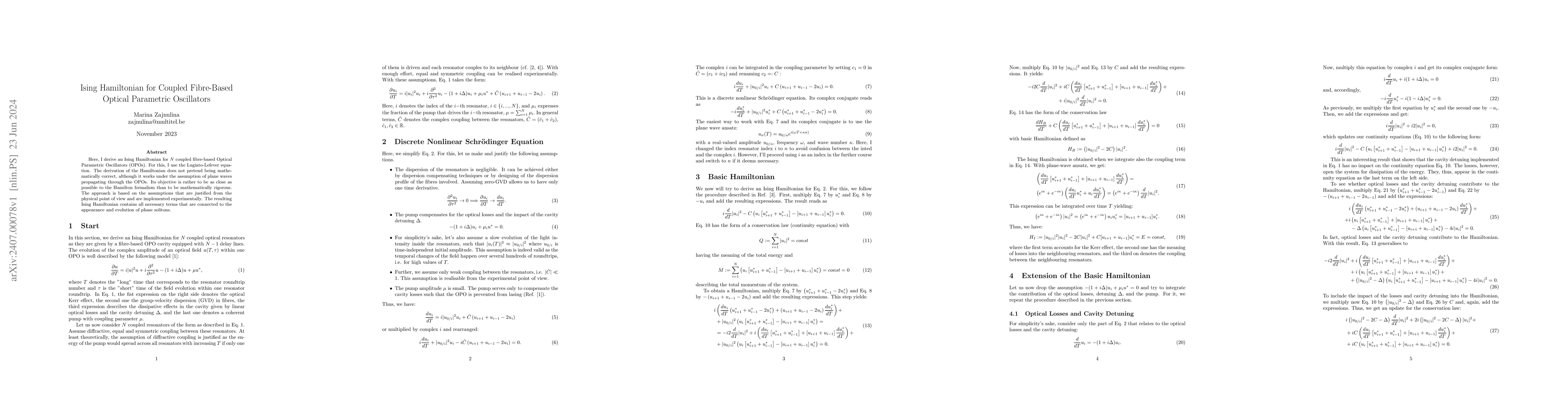 Here, I derive an Ising Hamiltonian for $N$ coupled fibre-based Optical Parametric Oscillators (OPOs). For this, I use the Lugiato-Lefever equation. The derivation of the Hamiltonian does not pretend to be mathematically correct, although it works under the assumption of plane waves propagating through the OPOs. Its objective is rather to be as close as possible to the Hamilton formalism than to be mathematically rigorous. The approach is based on the assumptions that are justified from the physical point of view and are implemented experimentally. The resulting Ising Hamiltonian contains all necessary terms that are connected to the appearance and evolution of phase solitons.