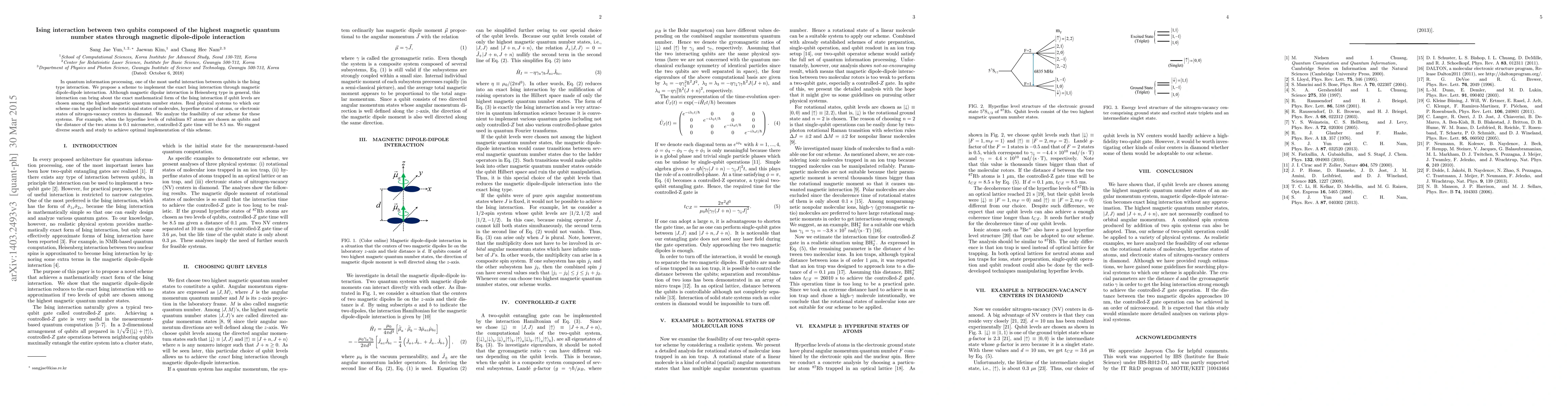 In quantum information processing, one of the most useful interaction between qubits is the Ising type interaction. We propose a scheme to implement the exact Ising interaction through magnetic dipole-dipole interaction. Although magnetic dipolar interaction is Heisenberg type in general, this interaction can bring about the exact mathematical form of the Ising interaction if qubit levels are chosen among the highest magnetic quantum number states. Real physical systems to which our scheme can be applied include rotational states of molecules, hyperfine states of atoms, or electronic states of nitrogen-vacancy centers in diamond. We analyze the feasibility of our scheme for these systems. For example, when the hyperfine levels of rubidium 87 atoms are chosen as qubits and the distance of the two atoms is 0.1 micrometer, controlled-Z gate time will be 8.5 ms. We suggest diverse search and study to achieve optimal implementation of this scheme.