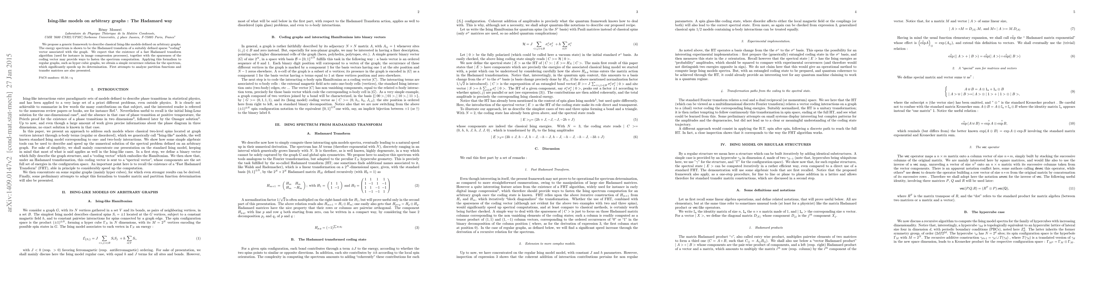 We propose a generic framework to describe classical Ising-like models defined on arbitrary graphs. The energy spectrum is shown to be the Hadamard transform of a suitably defined sparse "coding" vector associated with the graph. We expect that the existence of a fast Hadamard transform algorithm (used for instance in image ccompression processes), together with the sparseness of the coding vector, may provide ways to fasten the spectrum computation.. Applying this formalism to regular graphs, such as hypercubic graphs, we obtain a simple recurrence relation for the spectrum, which significantly speeds up its determination. First attempts to analyse partition functions and transfer matrices are also presented.