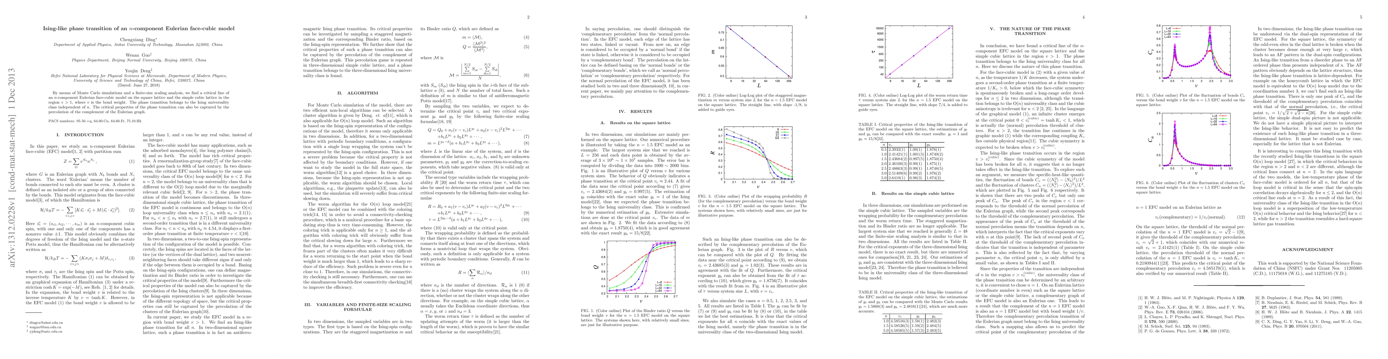 By means of Monte Carlo simulations and a finite-size scaling analysis, we find a critical line of an n-component Eulerian face-cubic model on the square lattice and the simple cubic lattice in the region v>1, where v is the bond weight. The phase transition belongs to the Ising universality class independent of n. The critical properties of the phase transition can also be captured by the percolation of the complement of the Eulerian graph.