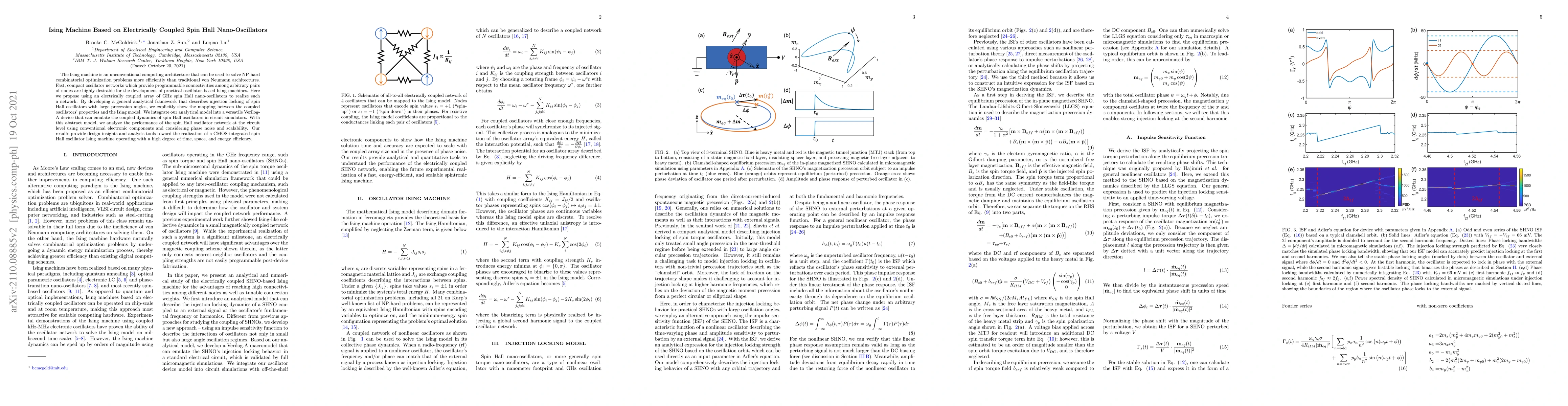 This paper proposes an electrically coupled array of spin Hall nano-oscillators to create a fast, compact network for an Ising machine, enabling efficient solutions to NP-hard problems. The study develops an analytical framework for injection locking and integrates it into a Verilog-A model to analyze performance, providing insights into designing a CMOS-integrated, highly efficient Ising machine.