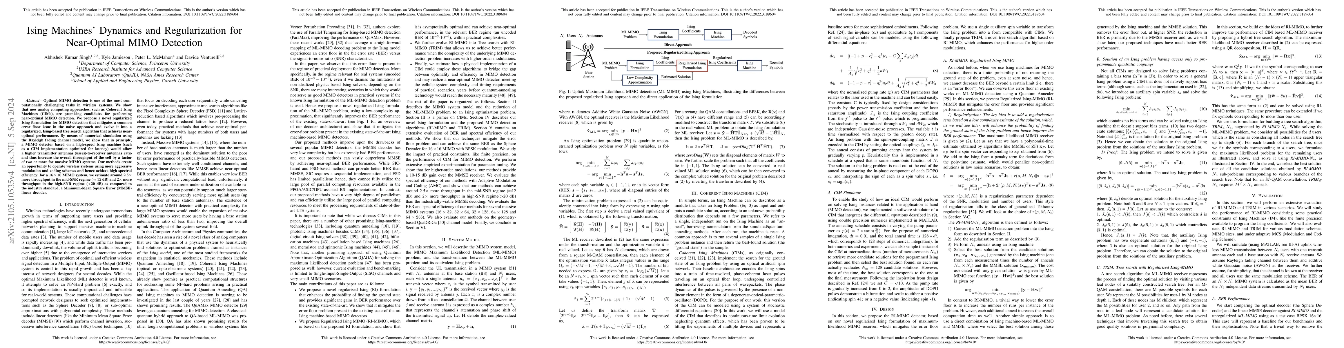 Optimal MIMO detection has been one of the most challenging and computationally inefficient tasks in wireless systems. We show that the new analog computing techniques like Coherent Ising Machines (CIM) are promising candidates for performing near-optimal MIMO detection. We propose a novel regularized Ising formulation for MIMO detection that mitigates a common error floor problem and further evolves it into an algorithm that achieves near-optimal MIMO detection. Massive MIMO systems, that have a large number of antennas at the Access point (AP), allow linear detectors to be near-optimal. However, the simplified detection in these systems comes at the cost of overall throughput, which could be improved by supporting more users. By means of numerical simulations, we show that in principle a MIMO detector based on a hybrid use of a CIM would allow us to add more transmitter antennas/users and increase the overall throughput of the cell by a significant factor. This would open up the opportunity to operate using more aggressive modulation and coding schemes and hence achieve high throughput: for a $16\times16$ large MIMO system, we estimate around 2.5$\times$ more throughput in mid-SNR regime ($\approx 12 dB$) and 2$\times$ more throughput in high-SNR regime( $>$ 20dB) than the industry standard, Minimum-Mean Square Error decoding (MMSE).