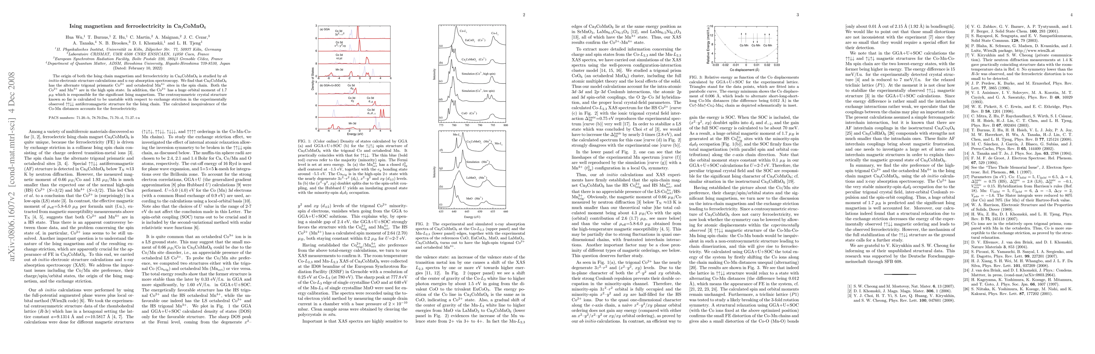 The origin of both the Ising chain magnetism and ferroelectricity in Ca$_3$CoMnO$_6$ is studied by $ab$ $initio$ electronic structure calculations and x-ray absorption spectroscopy. We find that Ca$_3$CoMnO$_6$ has the alternate trigonal prismatic Co$^{2+}$ and octahedral Mn$^{4+}$ sites in the spin chain. Both the Co$^{2+}$ and Mn$^{4+}$ are in the high spin state. In addition, the Co$^{2+}$ has a huge orbital moment of 1.7 $\mu_B$ which is responsible for the significant Ising magnetism. The centrosymmetric crystal structure known so far is calculated to be unstable with respect to exchange striction in the experimentally observed $\uparrow\uparrow\downarrow\downarrow$ antiferromagnetic structure for the Ising chain. The calculated inequivalence of the Co-Mn distances accounts for the ferroelectricity.
