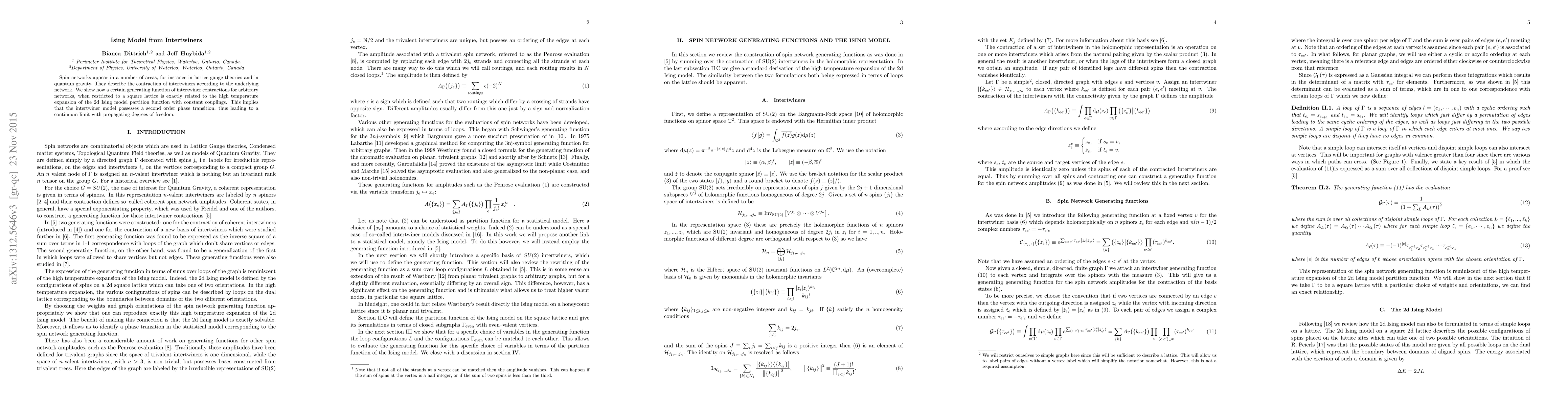 This paper demonstrates that the partition function of the 2D Ising model can be derived from the generating function of intertwiner contractions in spin networks, indicating a second-order phase transition and a continuum limit with propagating degrees of freedom.