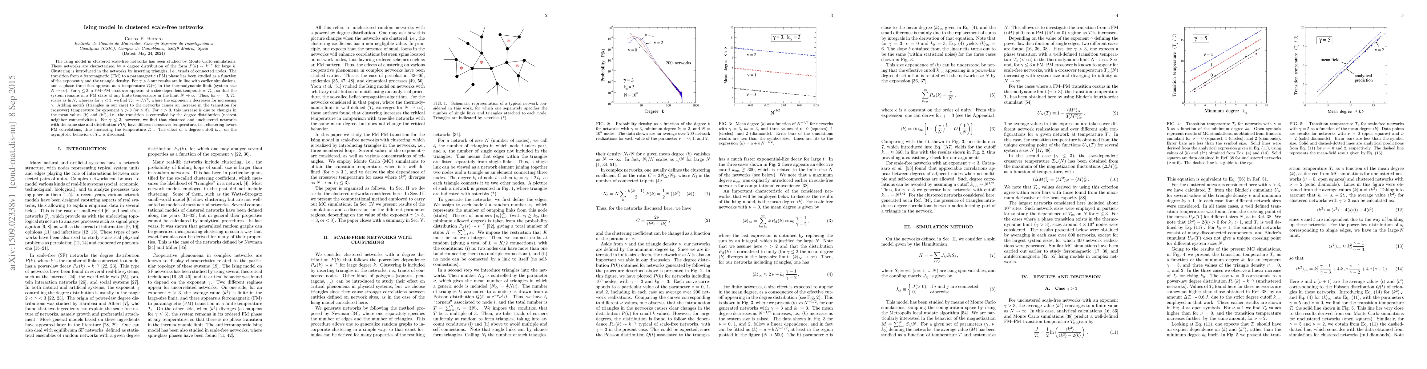 This study investigates the Ising model on clustered scale-free networks using Monte Carlo simulations, finding a phase transition for gamma > 3 and a ferromagnetic-paramagnetic crossover for gamma <= 3. Clustering enhances the transition temperature, with different mechanisms governing the effects for different gamma values.