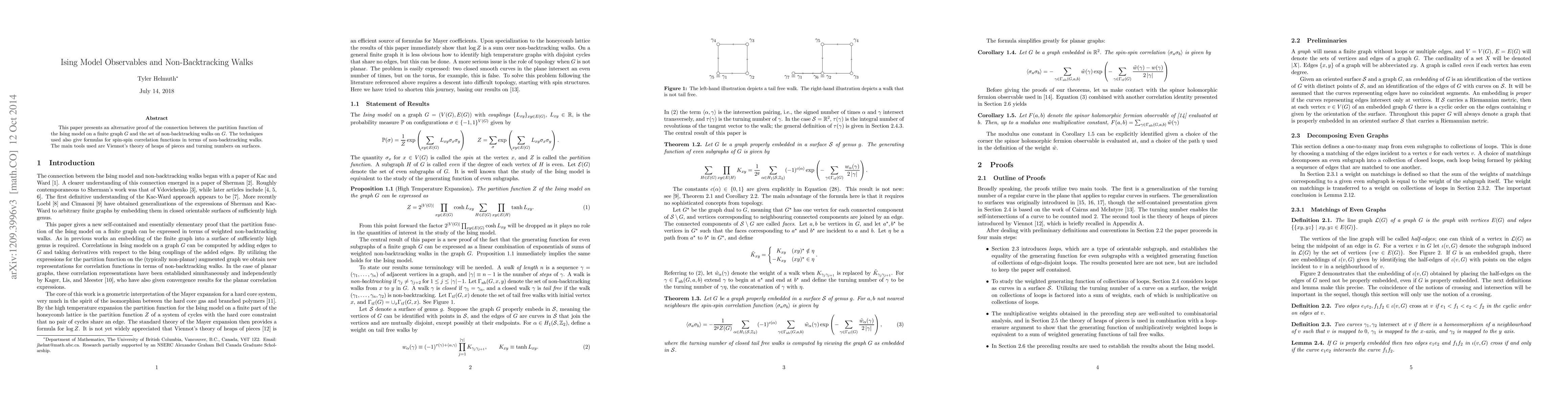 This paper provides an alternative proof linking the Ising model's partition function on a finite graph to non-backtracking walks, employing Viennot's heaps of pieces and turning numbers. It also derives spin-spin correlation functions using non-backtracking walks.