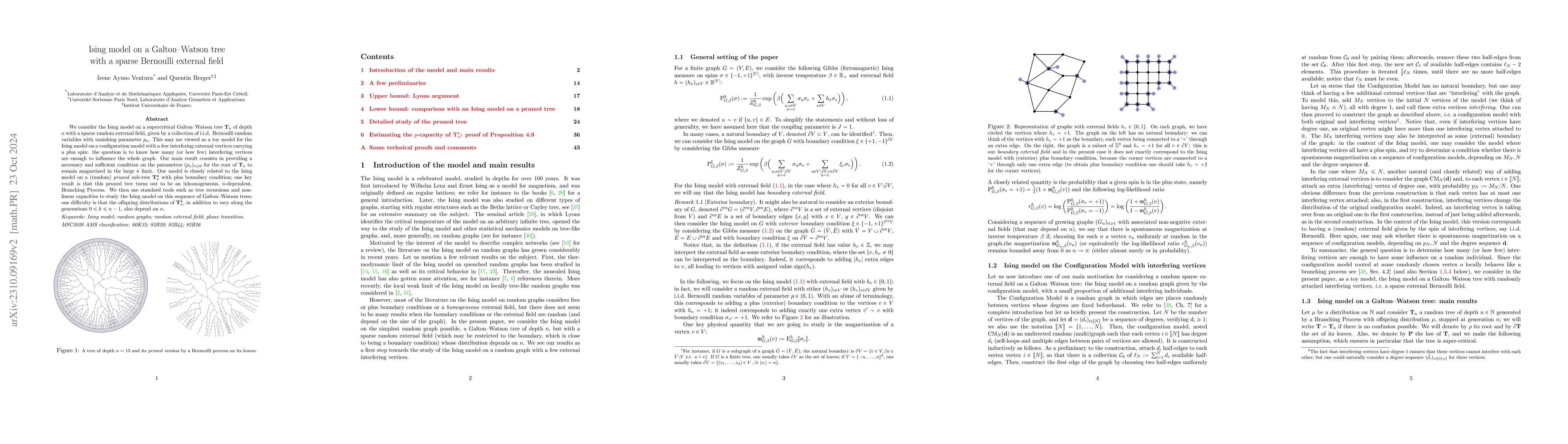 This paper investigates the Ising model on a supercritical Galton-Watson tree with a sparse random external field, determining the conditions under which the root remains magnetized as the tree depth increases. It finds that the pruned sub-tree behaves as an inhomogeneous, $n$-dependent branching process, and uses recursion and non-linear capacities to analyze the model.