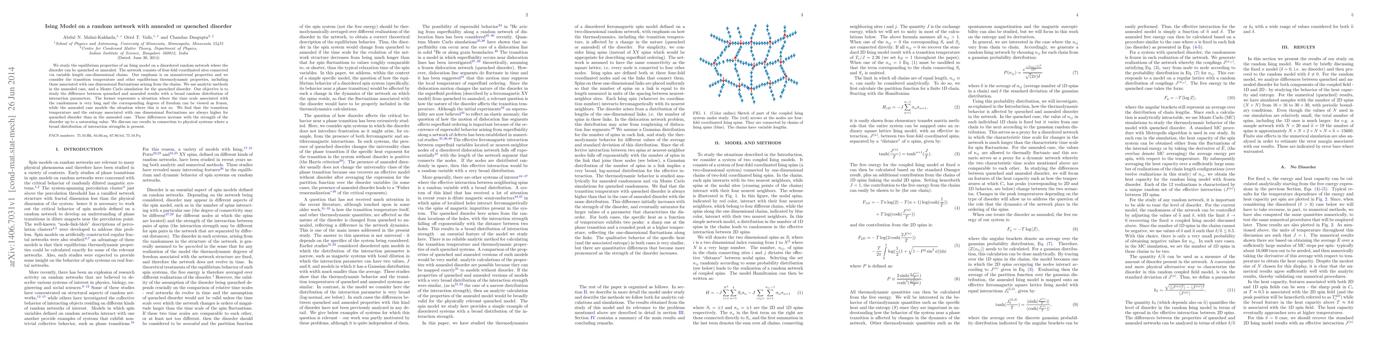 We study the equilibrium properties of an Ising model on a disordered random network where the disorder can be quenched or annealed. The network consists of four-fold coordinated sites connected via variable length one-dimensional chains. Our emphasis is on nonuniversal properties and we consider the transition temperature and other equilibrium thermodynamic properties, including those associated with one dimensional fluctuations arising from the chains. We use analytic methods in the annealed case, and a Monte Carlo simulation for the quenched disorder. Our objective is to study the difference between quenched and annealed results with a broad random distribution of interaction parameters. The former represents a situation where the time scale associated with the randomness is very long and the corresponding degrees of freedom can be viewed as frozen, while the annealed case models the situation where this is not so. We find that the transition temperature and the entropy associated with one dimensional fluctuations are always higher for quenched disorder than in the annealed case. These differences increase with the strength of the disorder up to a saturating value. We discuss our results in connection to physical systems where a broad distribution of interaction strengths is present.