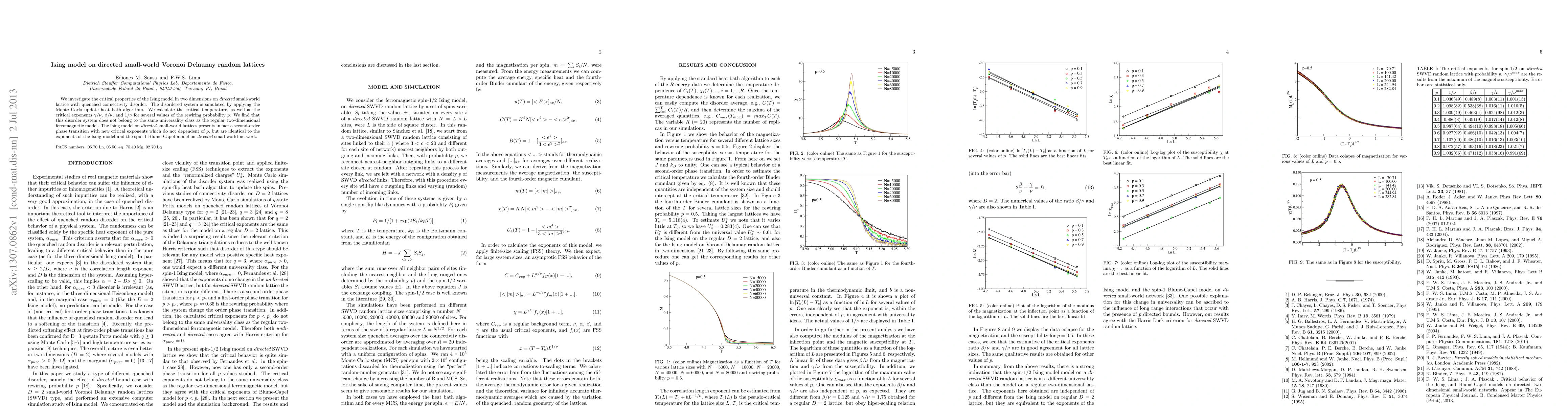 This study examines the critical behavior of the Ising model on directed small-world Voronoi Delaunay random lattices, revealing a second-order phase transition with unique critical exponents. Unlike the regular two-dimensional ferromagnetic model, these lattices exhibit distinct universality class characteristics.