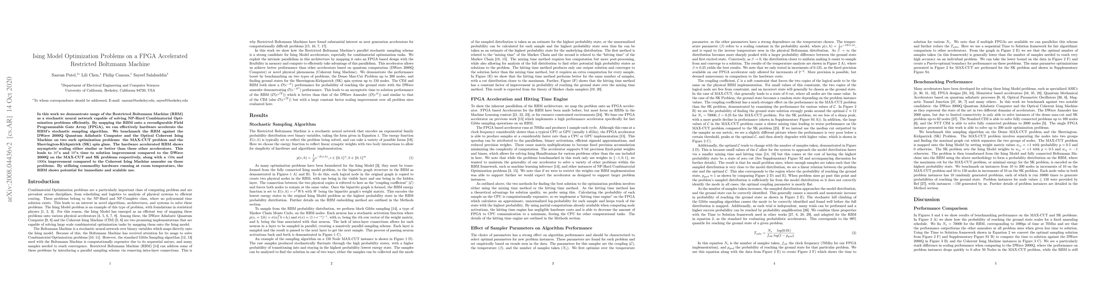 This paper demonstrates that mapping a Restricted Boltzmann Machine (RBM) onto a Field Programmable Gate Array (FPGA) can efficiently solve NP-Hard optimization problems, outperforming quantum annealers like the DWave 2000Q and the Optical Coherent Ising Machine (CIM) on benchmark problems. The FPGA-accelerated RBM shows significant improvements in time to solution and performance.