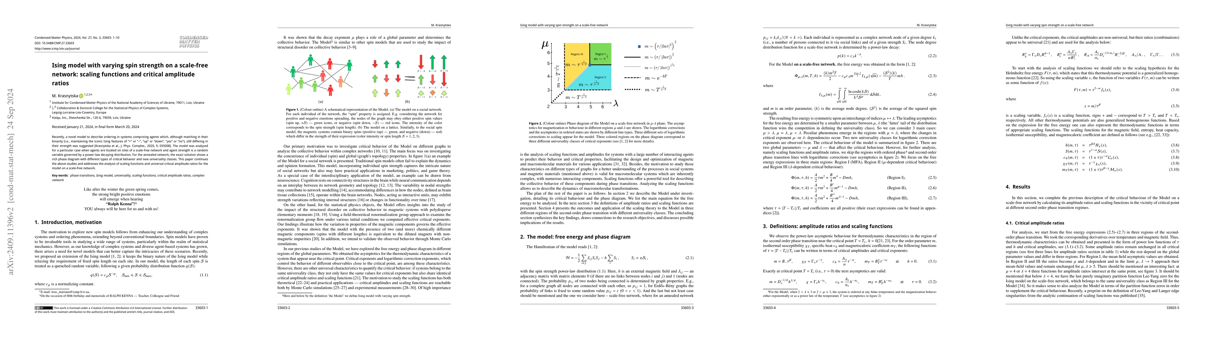 This paper examines the Ising model with varying spin strengths on a scale-free network, focusing on the analysis of scaling functions and universal critical amplitude ratios. It extends previous work on the model by investigating its critical behavior and new universality classes in this complex network setting.