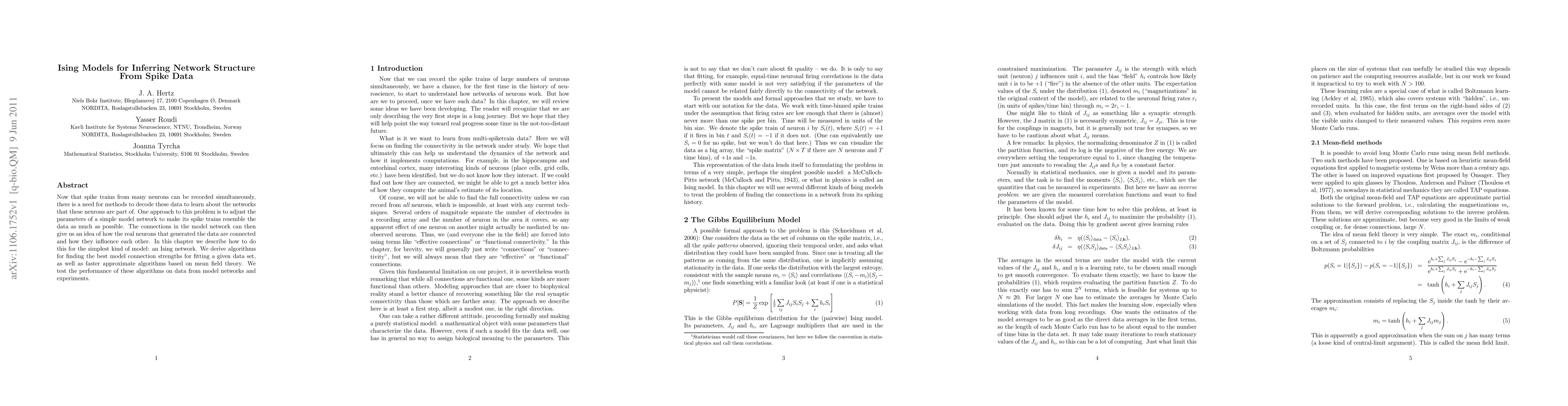 Now that spike trains from many neurons can be recorded simultaneously, there is a need for methods to decode these data to learn about the networks that these neurons are part of. One approach to this problem is to adjust the parameters of a simple model network to make its spike trains resemble the data as much as possible. The connections in the model network can then give us an idea of how the real neurons that generated the data are connected and how they influence each other. In this chapter we describe how to do this for the simplest kind of model: an Ising network. We derive algorithms for finding the best model connection strengths for fitting a given data set, as well as faster approximate algorithms based on mean field theory. We test the performance of these algorithms on data from model networks and experiments.