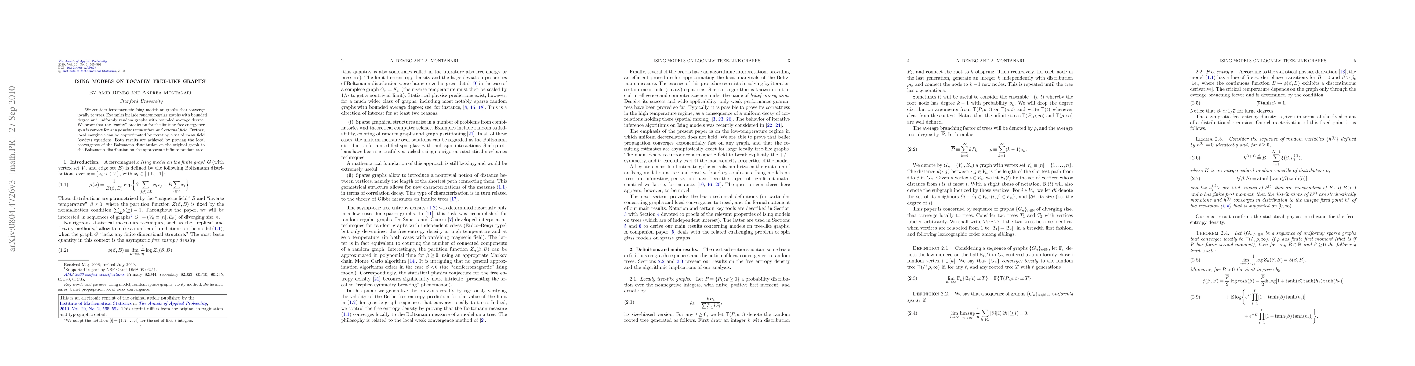 This paper proves that the cavity prediction accurately describes the limiting free energy per spin for ferromagnetic Ising models on locally tree-like graphs, such as random regular graphs and uniformly random graphs. It also shows that local marginals can be approximated through mean field equations, achieved by demonstrating the convergence of the Boltzmann distribution on these graphs to the distribution on an infinite random tree.