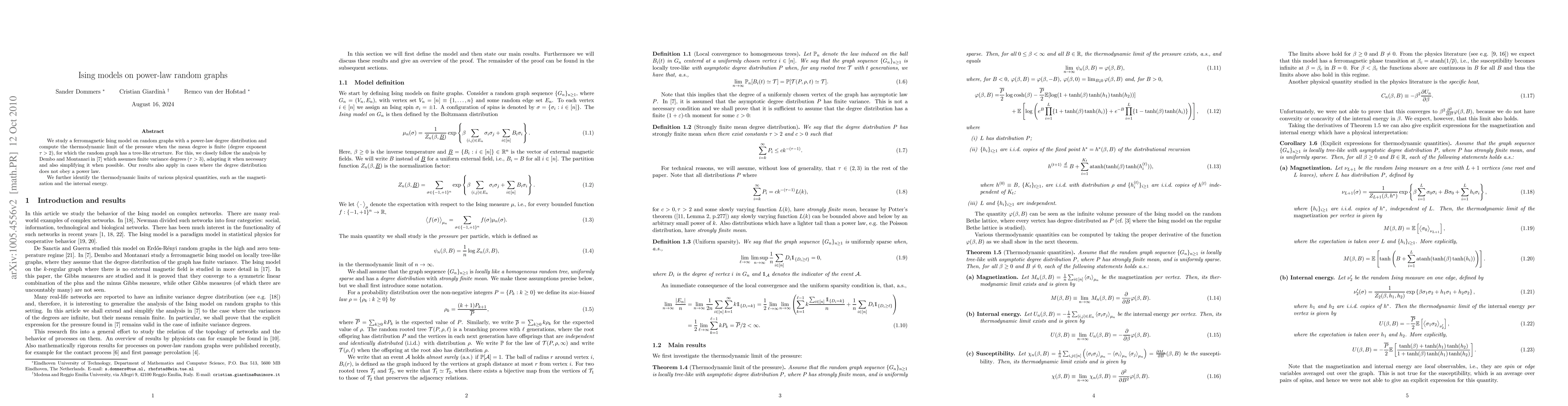 The paper investigates a ferromagnetic Ising model on random graphs with power-law degree distributions and computes thermodynamic limits of pressure, magnetization, and internal energy for finite mean degrees and tree-like structures.