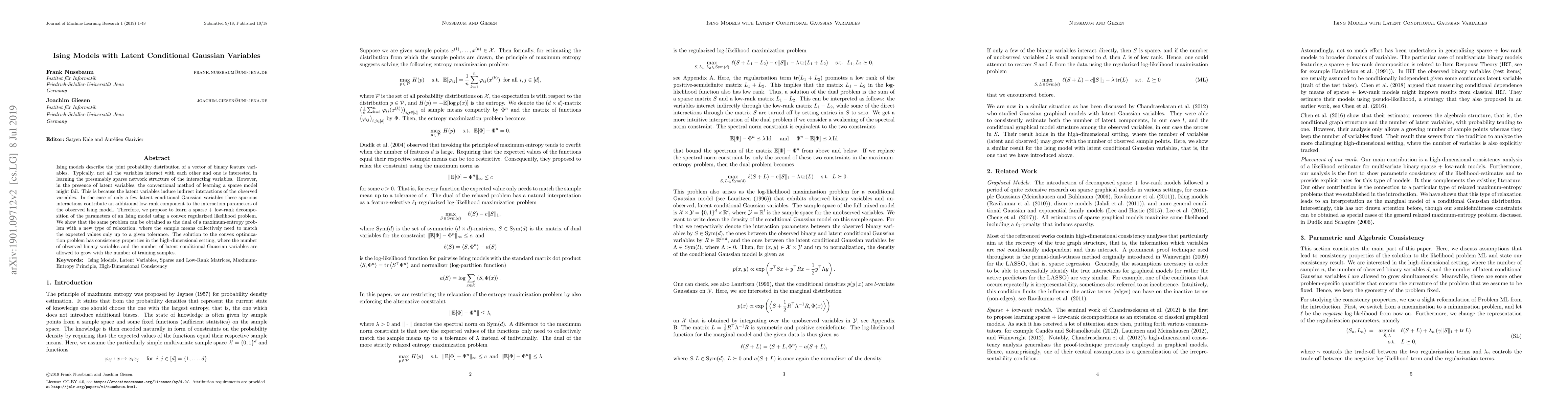 This paper proposes a method to learn the sparse network structure of Ising models in the presence of latent conditional Gaussian variables, addressing the issue of indirect interactions induced by these latent variables. The approach involves a sparse + low-rank decomposition of the model parameters, achieved through a convex regularized likelihood problem, ensuring consistency in high-dimensional settings.