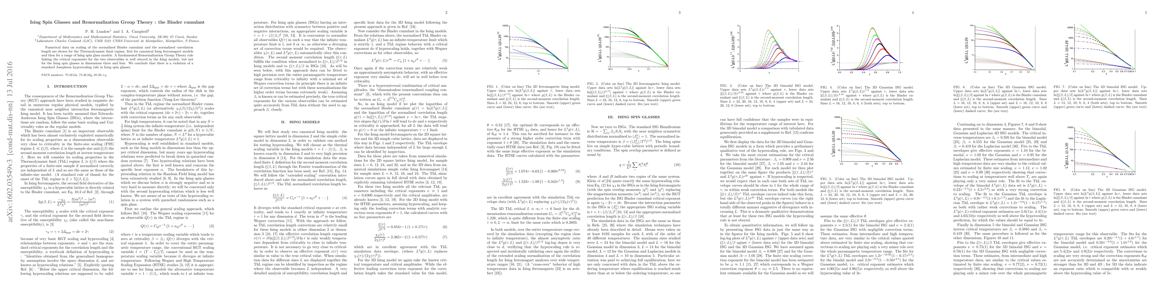 This paper investigates the scaling behavior of the normalized Binder cumulant and correlation length in Ising ferromagnet and spin glass models, finding that while Renormalization Group Theory rules apply to ferromagnets, they do not hold for spin glasses in dimensions three and four, indicating a violation of the Josephson hyperscaling rule in Ising spin glasses.