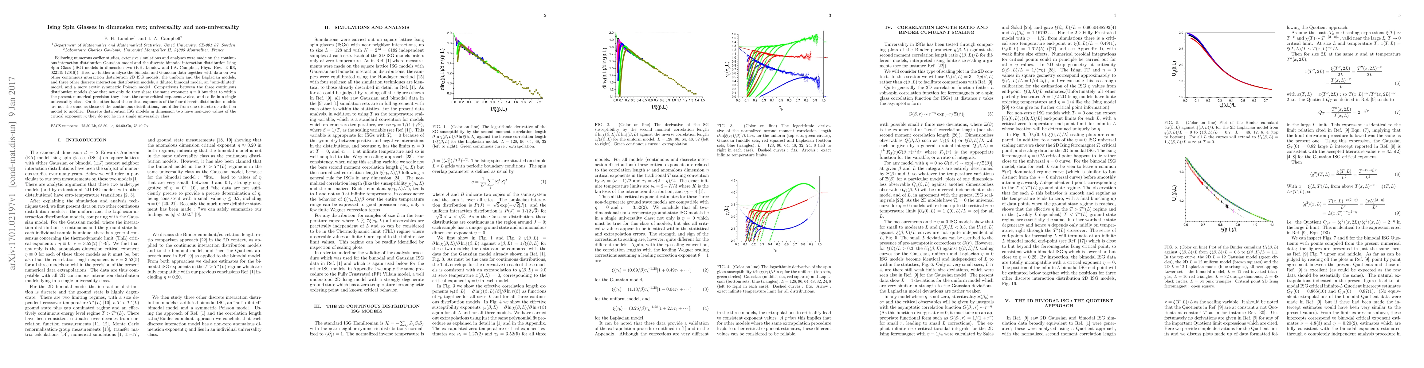 Following numerous earlier studies, extensive simulations and analyses were made on the continuous interaction distribution Gaussian model and the discrete bimodal interaction distribution Ising Spin Glass (ISG) models in dimension two (P.H. Lundow and I.A. Campbell, Phys. Rev. E {\bf 93}, 022119 (2016)). Here we further analyse the bimodal and Gaussian data together with data on two other continuous interaction distribution 2D ISG models, the uniform and the Laplacian models, and three other discrete interaction distribution models, a diluted bimodal model, an "anti-diluted" model, and a more exotic symmetric Poisson model. Comparisons between the three continuous distribution models show that not only do they share the same exponent $\eta \equiv 0$ but that to within the present numerical precision they share the same critical exponent $\nu$ also, and so lie in a single universality class. On the other hand the critical exponents of the four discrete distribution models are not the same as those of the continuous distributions, and differ from one discrete distribution model to another. Discrete distribution ISG models in dimension two have non-zero values of the critical exponent $\eta$; they do not lie in a single universality class.