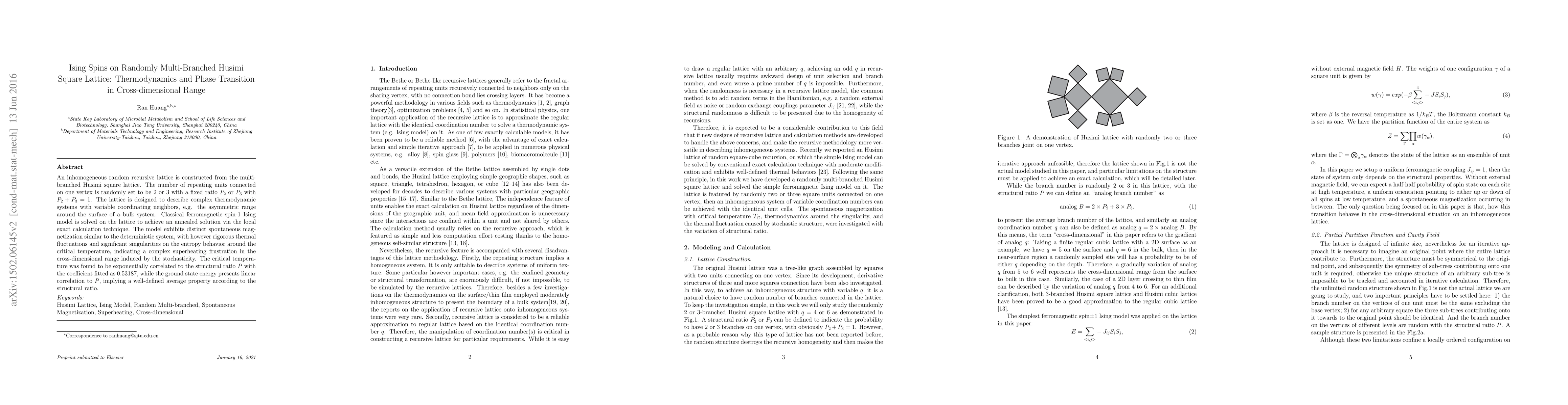 This paper investigates the thermodynamics and phase transition of an Ising spin model on a randomly multi-branched Husimi square lattice, revealing complex entropy behavior and critical temperature exponentially correlated to the structural ratio. The model demonstrates distinct spontaneous magnetization and significant thermal fluctuations, indicating superheating and supercooling frustration.