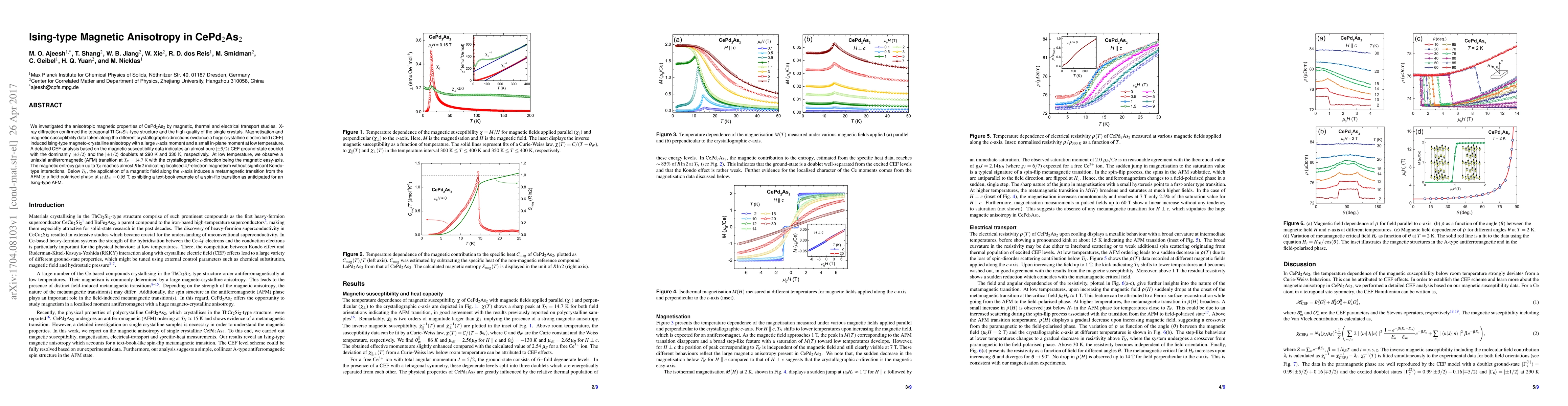 We investigated the anisotropic magnetic properties of CePd$_2$As$_2$ by magnetic, thermal and electrical transport studies. X-ray diffraction confirmed the tetragonal ThCr$_2$Si$_2$-type structure and the high-quality of the single crystals. Magnetisation and magnetic susceptibility data taken along the different crystallographic directions evidence a huge crystalline electric field (CEF) induced Ising-type magneto-crystalline anisotropy with a large $c$-axis moment and a small in-plane moment at low temperature. A detailed CEF analysis based on the magnetic susceptibility data indicates an almost pure $\langle\pm5/2 \rvert$ CEF ground-state doublet with the dominantly $\langle\pm3/2 \rvert$ and the $\langle\pm1/2 \rvert$ doublets at 290 K and 330 K, respectively. At low temperature, we observe a uniaxial antiferromagnetic (AFM) transition at $T_N=14.7$ K with the crystallographic $c$-direction being the magnetic easy-axis. The magnetic entropy gain up to $T_N$ reaches almost $R\ln2$ indicating localised $4f$-electron magnetism without significant Kondo-type interactions. Below $T_N$, the application of a magnetic field along the $c$-axis induces a metamagnetic transition from the AFM to a field-polarised phase at $\mu_0H_{c0}=0.95$ T, exhibiting a text-book example of a spin-flip transition as anticipated for an Ising-type AFM.