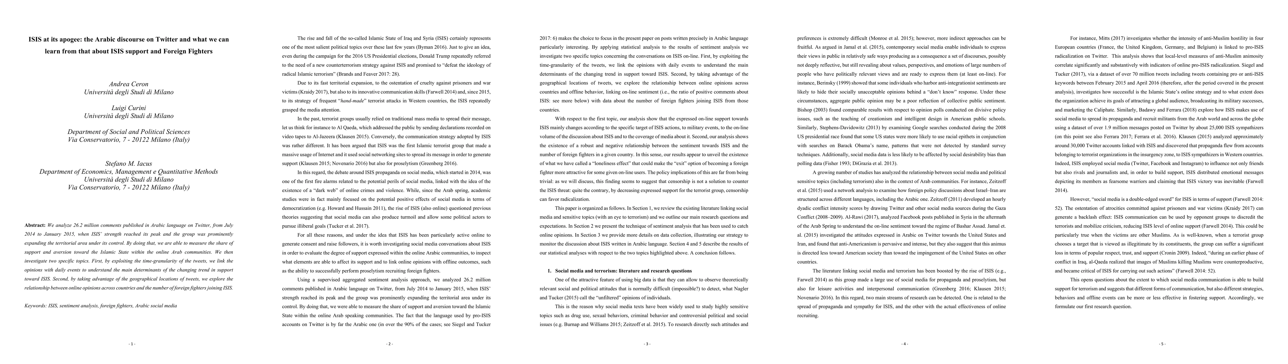 We analyze 26.2 million comments published in Arabic language on Twitter, from July 2014 to January 2015, when ISIS' strength reached its peak and the group was prominently expanding the territorial area under its control. By doing that, we are able to measure the share of support and aversion toward the Islamic State within the online Arab communities. We then investigate two specific topics. First, by exploiting the time-granularity of the tweets, we link the opinions with daily events to understand the main determinants of the changing trend in support toward ISIS. Second, by taking advantage of the geographical locations of tweets, we explore the relationship between online opinions across countries and the number of foreign fighters joining ISIS.
