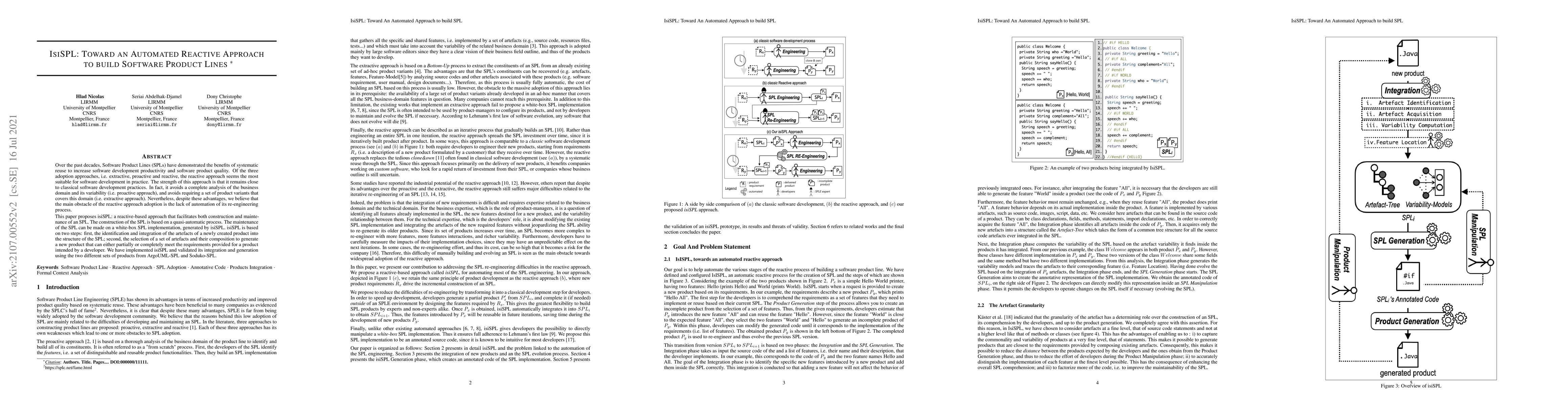 Over the past decades, Software Product Lines (SPLs) have demonstrated the benefits of systematic reuse to increase software development productivity and software product quality. Of the three adoption approaches, i.e. extractive, proactive and reactive, the reactive approach seems the most suitable for software development in practice. The strength of this approach is that it remains close to classical software development practices. In fact, it avoids a complete analysis of the business domain and its variability (i.e. proactive approach), and avoids requiring a set of product variants that covers this domain (i.e. extractive approach). Nevertheless, despite these advantages, we believe that the main obstacle of the reactive approach adoption is the lack of automation of its re-engineering process. This paper proposes isiSPL: a reactive-based approach that facilitates both construction and maintenance of an SPL. The construction of the SPL is based on a quasi-automatic process. The maintenance of the SPL can be made on a white-box SPL implementation, generated by isiSPL. isiSPL is based on two steps: first, the identification and integration of the artefacts of a newly created product into the structure of the SPL; second, the selection of a set of artefacts and their composition to generate a new product that can either partially or completely meet the requirements provided for a product intended by a developer. We have implemented isiSPL and validated its integration and generation using the two different sets of products from ArgoUML-SPL and Soduko-SPL.