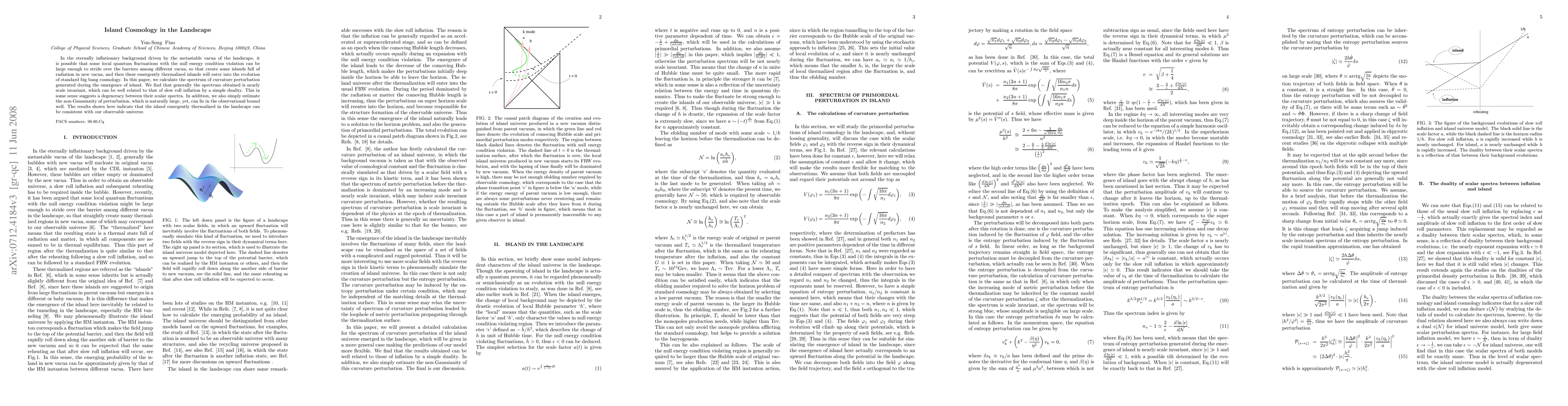 In the eternally inflationary background driven by the metastable vacua of the landscape, it is possible that some local quantum fluctuations with the null energy condition violation can be large enough to stride over the barriers among different vacua, so that create some islands full of radiation in new vacua, and then these emergently thermalized islands will enter into the evolution of standard big bang cosmology. In this paper, we calculate the spectrum of curvature perturbation generated during the emergence of island. We find that generally the spectrum obtained is nearly scale invariant, which can be well related to that of slow roll inflation by a simple duality. This in some sense suggests a degeneracy between their scalar spectra. In addition, we also simply estimate the non-Gaussianity of perturbation, which is naturally large, yet, can lie well in the observational bound. The results shown here indicate that the island emergently thermalized in the landscape can be consistent with our observable universe.