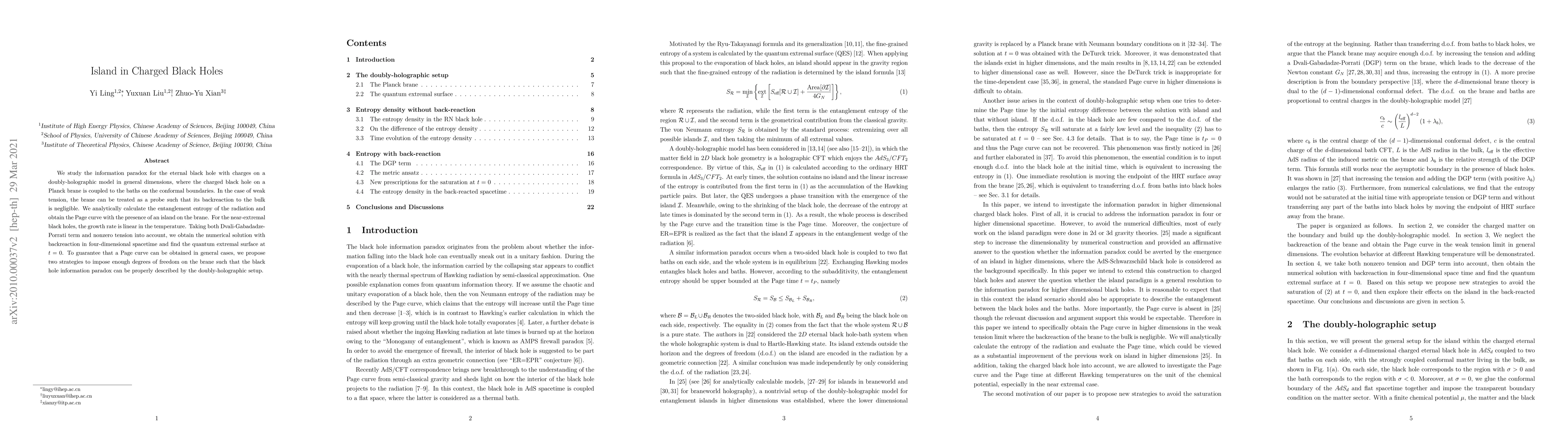 We study the information paradox for the eternal black hole with charges on a doubly-holographic model in general dimensions, where the charged black hole on a Planck brane is coupled to the baths on the conformal boundaries. In the case of weak tension, the brane can be treated as a probe such that its backreaction to the bulk is negligible. We analytically calculate the entanglement entropy of the radiation and obtain the Page curve with the presence of an island on the brane. For the near-extremal black holes, the growth rate is linear in the temperature. Taking both Dvali-Gabadadze-Porrati term and nonzero tension into account, we obtain the numerical solution with backreaction in four-dimensional spacetime and find the quantum extremal surface at $t=0$. To guarantee that a Page curve can be obtained in general cases, we propose two strategies to impose enough degrees of freedom on the brane such that the black hole information paradox can be properly described by the doubly-holographic setup.