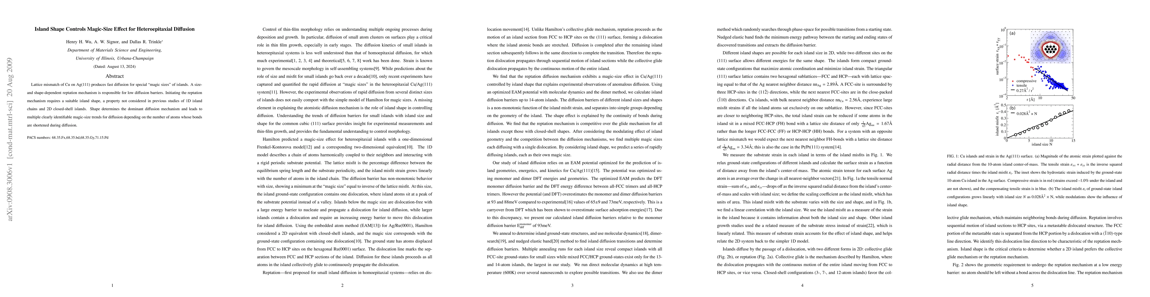 Lattice mismatch of Cu on Ag(111) produces fast diffusion for special "magic sizes" of islands. A size- and shape-dependent reptation mechanism is responsible for low diffusion barriers. Initiating the reptation mechanism requires a suitable island shape, a property not considered in previous studies of 1D island chains and 2D closed-shell islands. Shape determines the dominant diffusion mechanism and leads to multiple clearly identifiable magic-size trends for diffusion depending on the number of atoms whose bonds are shortened during diffusion.