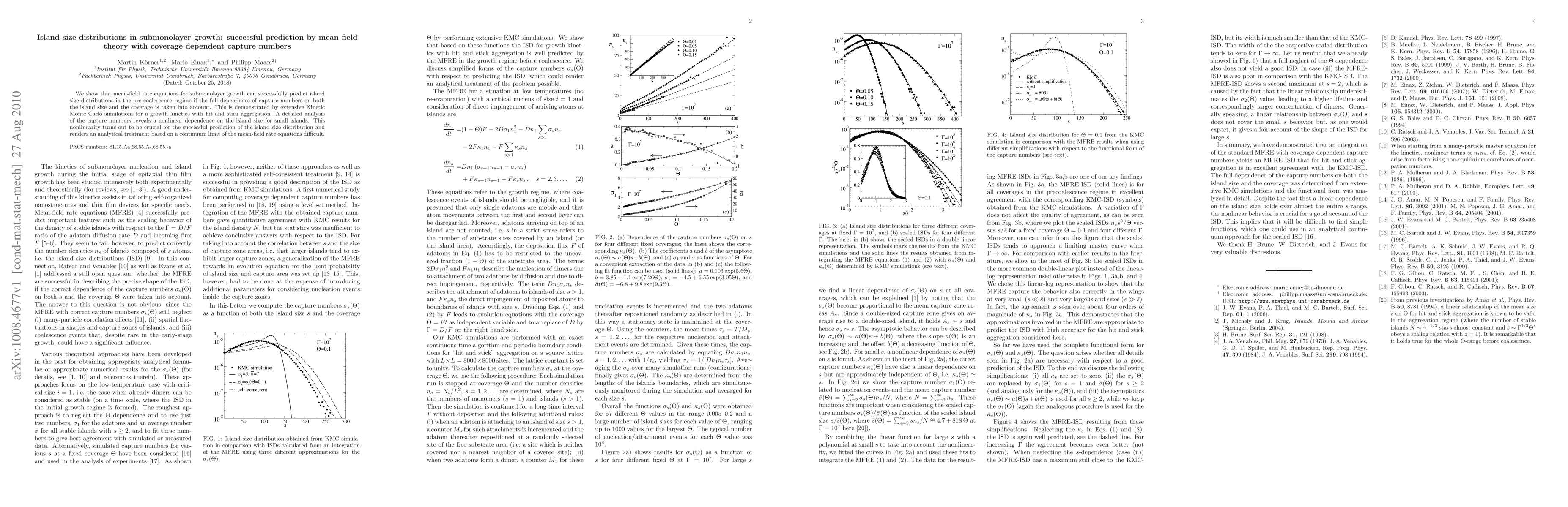 Summary: Mean-field rate equations accurately predict island size distributions in submonolayer growth when incorporating coverage-dependent capture numbers, as demonstrated by Kinetic Monte Carlo simulations. The nonlinear dependence of capture numbers on island size is essential for these predictions and complicates analytical continuum treatments.