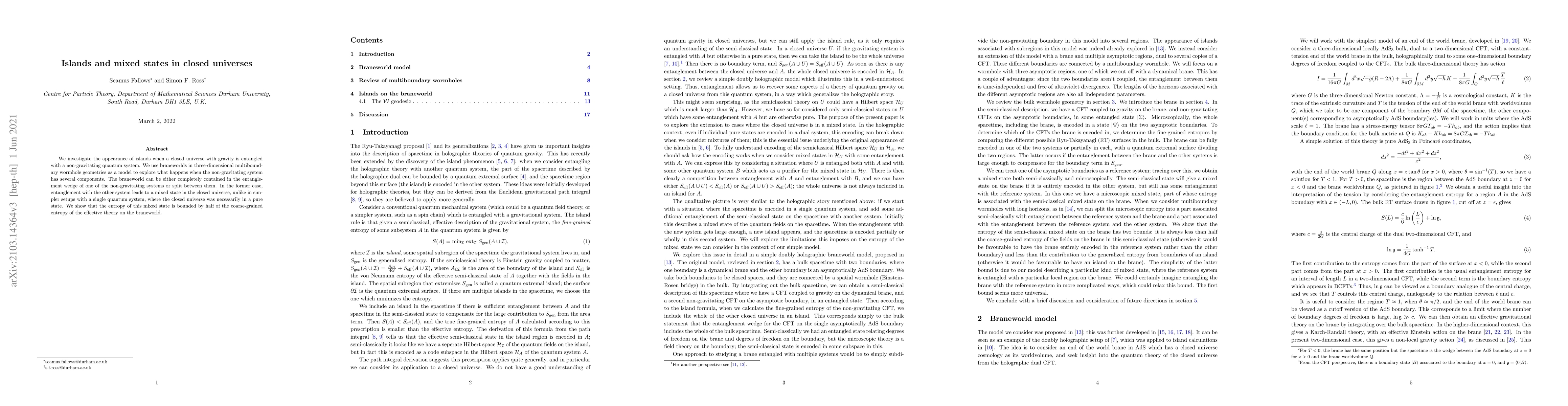 We investigate the appearance of islands when a closed universe with gravity is entangled with a non-gravitating quantum system. We use braneworlds in three-dimensional multiboundary wormhole geometries as a model to explore what happens when the non-gravitating system has several components. The braneworld can be either completely contained in the entanglement wedge of one of the non-gravitating systems or split between them. In the former case, entanglement with the other system leads to a mixed state in the closed universe, unlike in simpler setups with a single quantum system, where the closed universe was necessarily in a pure state. We show that the entropy of this mixed state is bounded by half of the coarse-grained entropy of the effective theory on the braneworld.