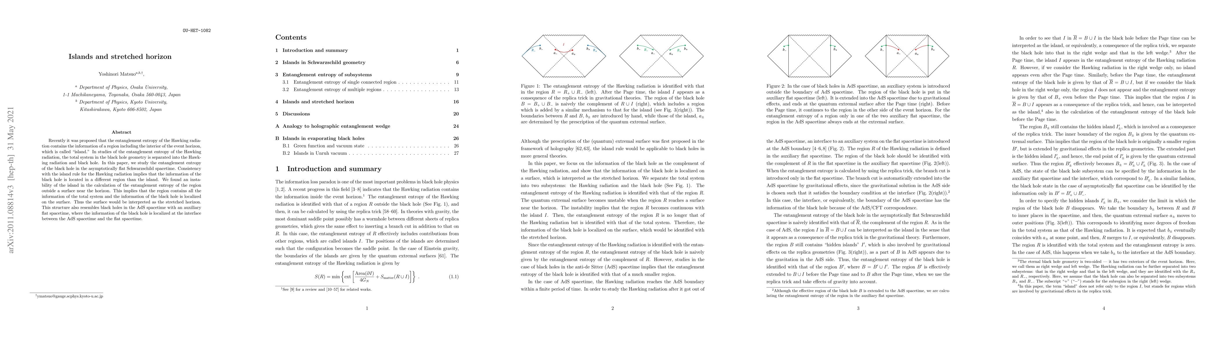 This paper explores the concept of 'islands' in black hole entropy, finding that information of a Schwarzschild black hole is localized on a surface near the horizon, akin to a 'stretched horizon'. This structure parallels observations in AdS black holes. The study suggests an instability in island formation when considering black hole entanglement entropy outside horizon-near surfaces.