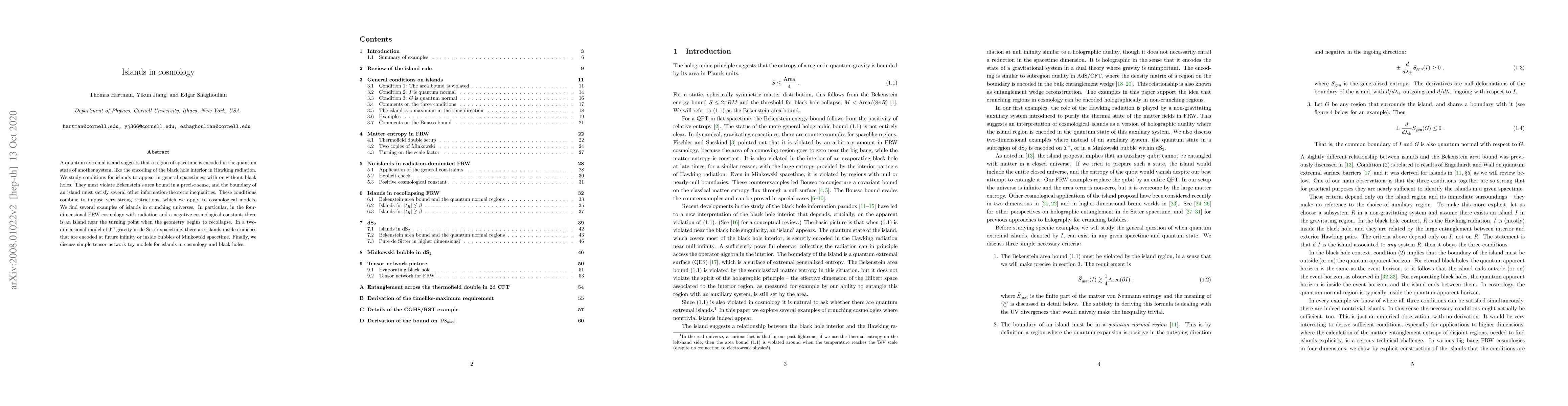 A quantum extremal island suggests that a region of spacetime is encoded in the quantum state of another system, like the encoding of the black hole interior in Hawking radiation. We study conditions for islands to appear in general spacetimes, with or without black holes. They must violate Bekenstein's area bound in a precise sense, and the boundary of an island must satisfy several other information-theoretic inequalities. These conditions combine to impose very strong restrictions, which we apply to cosmological models. We find several examples of islands in crunching universes. In particular, in the four-dimensional FRW cosmology with radiation and a negative cosmological constant, there is an island near the turning point when the geometry begins to recollapse. In a two-dimensional model of JT gravity in de Sitter spacetime, there are islands inside crunches that are encoded at future infinity or inside bubbles of Minkowski spacetime. Finally, we discuss simple tensor network toy models for islands in cosmology and black holes.