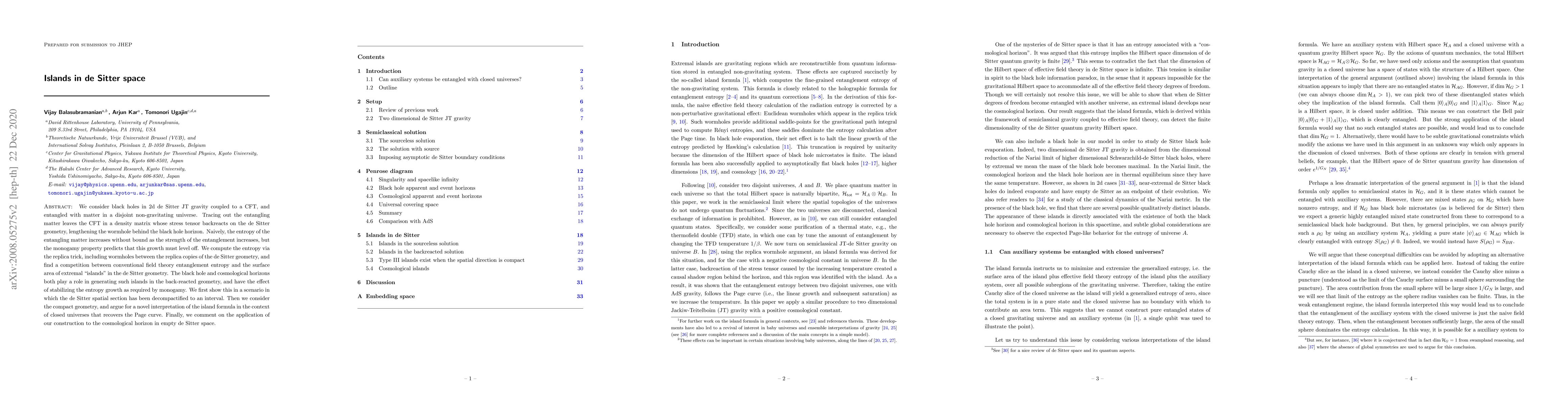 We consider black holes in 2d de Sitter JT gravity coupled to a CFT, and entangled with matter in a disjoint non-gravitating universe. Tracing out the entangling matter leaves the CFT in a density matrix whose stress tensor backreacts on the de Sitter geometry, lengthening the wormhole behind the black hole horizon. Naively, the entropy of the entangling matter increases without bound as the strength of the entanglement increases, but the monogamy property predicts that this growth must level off. We compute the entropy via the replica trick, including wormholes between the replica copies of the de Sitter geometry, and find a competition between conventional field theory entanglement entropy and the surface area of extremal "islands" in the de Sitter geometry. The black hole and cosmological horizons both play a role in generating such islands in the back-reacted geometry, and have the effect of stabilizing the entropy growth as required by monogamy. We first show this in a scenario in which the de Sitter spatial section has been decompactified to an interval. Then we consider the compact geometry, and argue for a novel interpretation of the island formula in the context of closed universes that recovers the Page curve. Finally, we comment on the application of our construction to the cosmological horizon in empty de Sitter space.