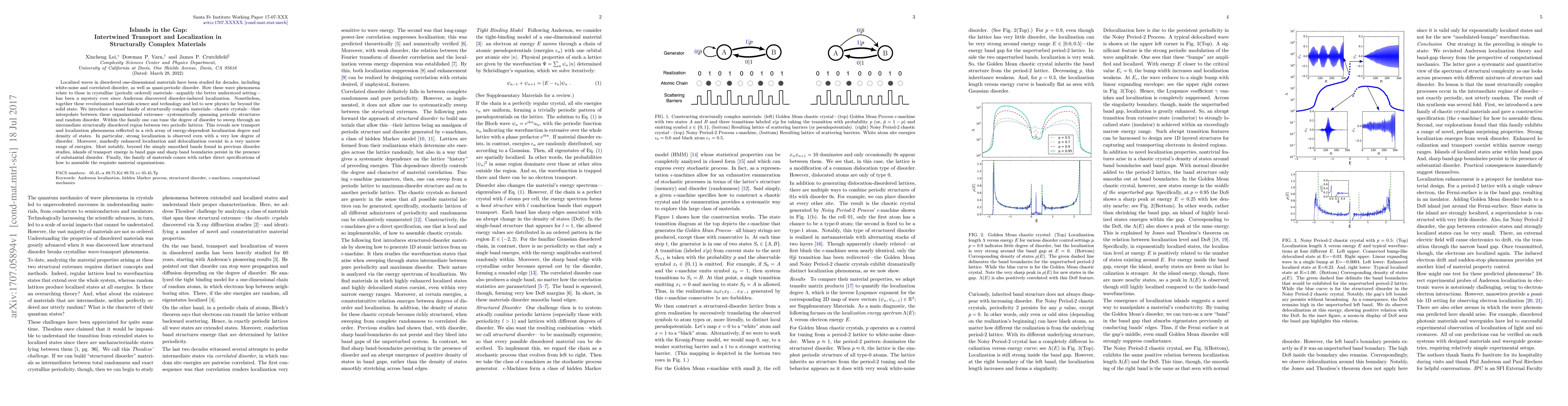 Localized waves in disordered one-dimensional materials have been studied for decades, including white-noise and correlated disorder, as well as quasi-periodic disorder. How these wave phenomena relate to those in crystalline (periodic ordered) materials---arguably the better understood setting---has been a mystery ever since Anderson discovered disorder-induced localization. Nonetheless, together these revolutionized materials science and technology and led to new physics far beyond the solid state. We introduce a broad family of structurally complex materials---chaotic crystals---that interpolate between these organizational extremes---systematically spanning periodic structures and random disorder. Within the family one can tune the degree of disorder to sweep through an intermediate structurally disordered region between two periodic lattices. This reveals new transport and localization phenomena reflected in a rich array of energy-dependent localization degree and density of states. In particular, strong localization is observed even with a very low degree of disorder. Moreover, markedly enhanced localization and delocalization coexist in a very narrow range of energies. Most notably, beyond the simply smoothed bands found in previous disorder studies, islands of transport emerge in band gaps and sharp band boundaries persist in the presence of substantial disorder. Finally, the family of materials comes with rather direct specifications of how to assemble the requisite material organizations.