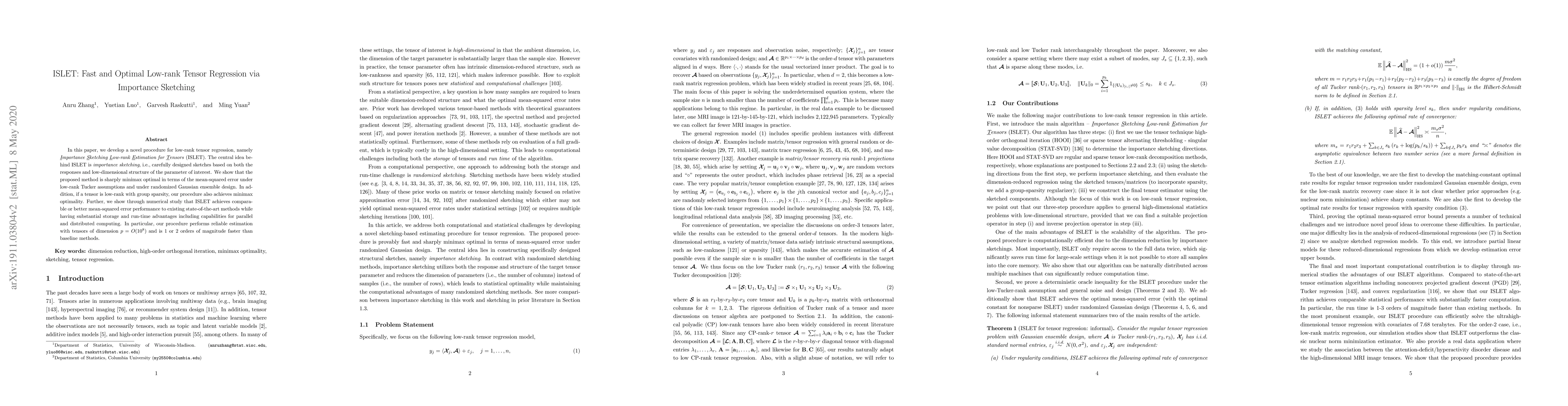 The paper introduces the ISLET procedure, which leverages importance sketching for efficient low-rank tensor regression, providing theoretical guarantees of optimality and empirical evidence of superior performance.