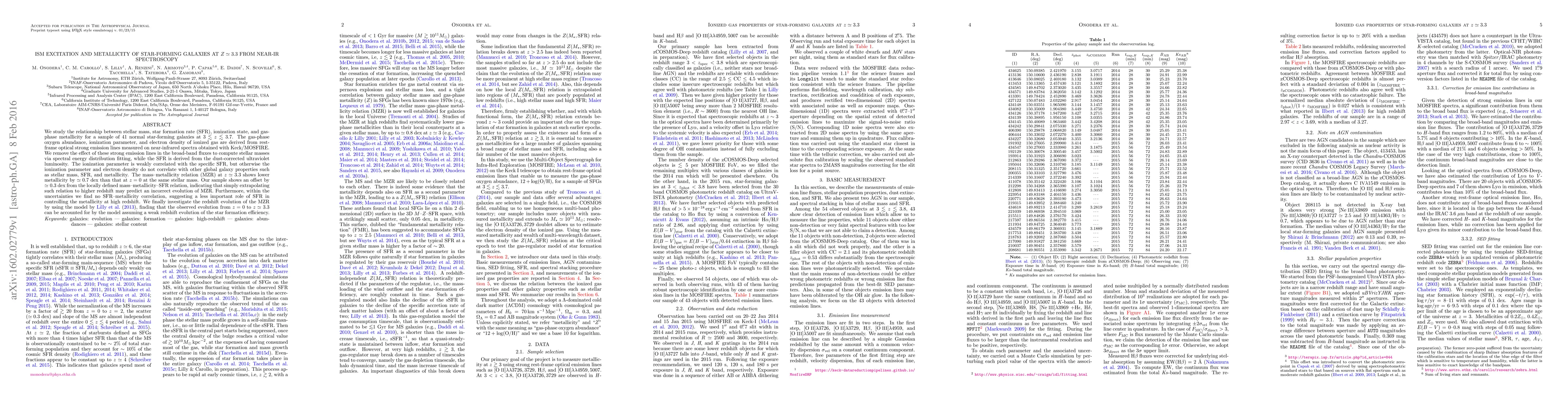 This study investigates the ISM excitation, metallicity, and star formation in star-forming galaxies at $z\simeq3.3$ using near-IR spectroscopy. The findings show a lower metallicity at high redshift compared to local galaxies and suggest a less significant role of star formation rate in determining metallicity at this epoch.
