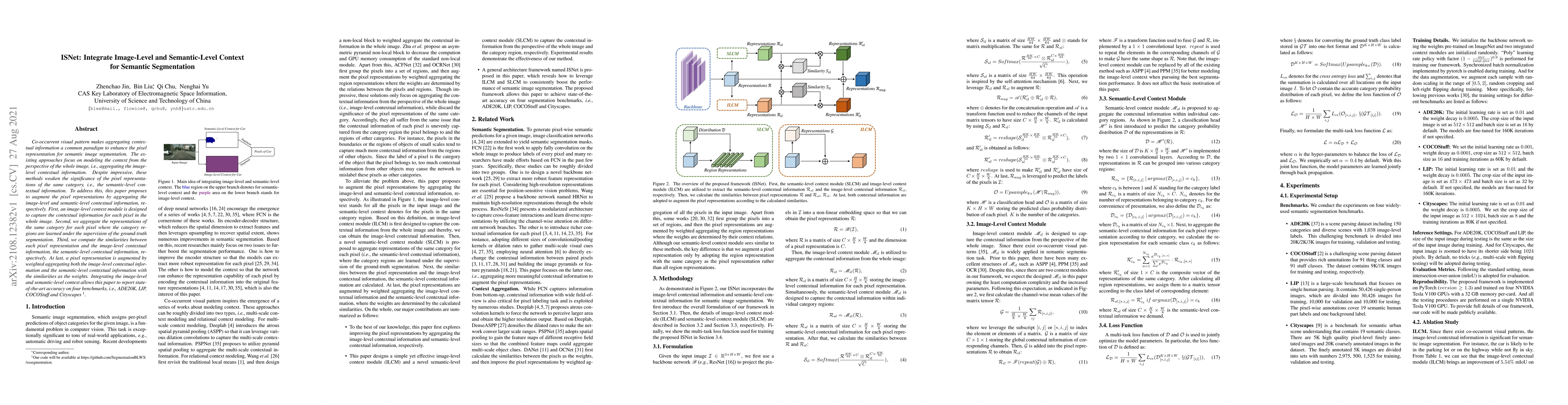 ISNet integrates image-level and semantic-level context to enhance pixel representations for semantic segmentation, achieving state-of-the-art accuracy on multiple benchmarks by balancing both contextual information types. The method combines whole-image context and category-specific context to improve segmentation performance.