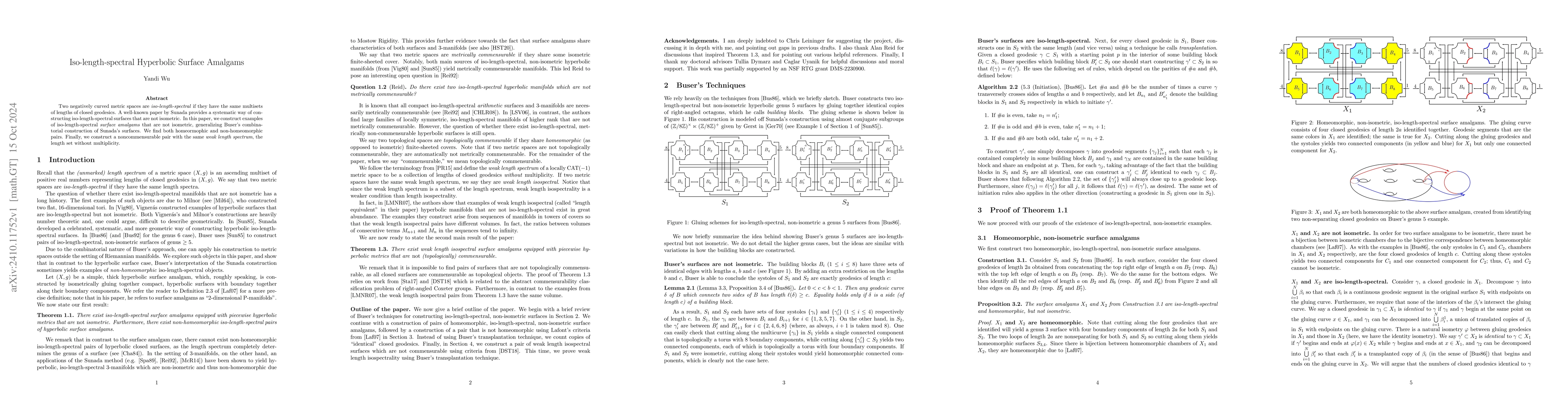 This paper constructs iso-length-spectral hyperbolic surface amalgams that are not isometric, generalizing Sunada's method and Buser's combinatorial approach. It identifies both homeomorphic and non-homeomorphic pairs, and finds a noncommensurable pair with identical weak length spectra.