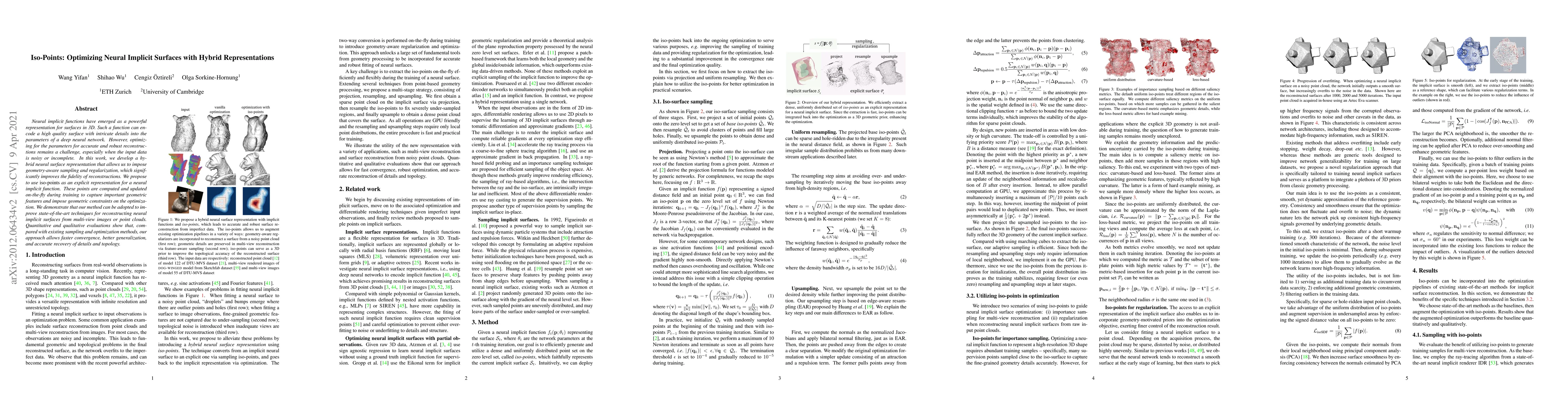 This paper presents a hybrid neural surface representation using iso-points to optimize neural implicit functions for 3D surface reconstruction. The method imposes geometry-aware sampling and regularization, leading to faster convergence, better generalization, and accurate recovery of intricate details and topology.