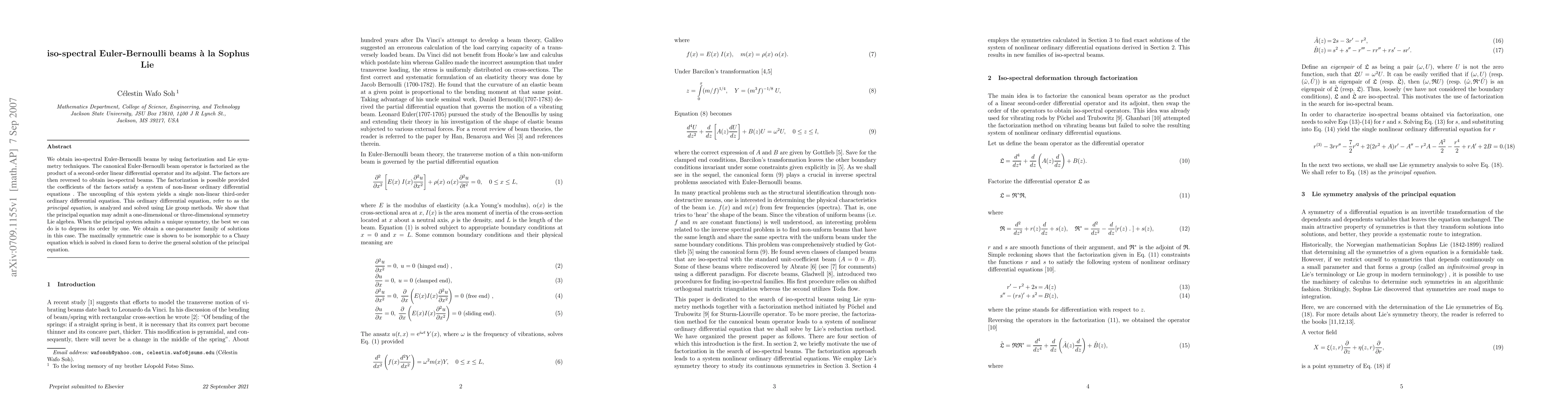 This paper uses factorization and Lie symmetry techniques to derive iso-spectral Euler-Bernoulli beams, factorizing the canonical beam operator and solving a principal third-order differential equation using Lie group methods to find a one-parameter family of solutions. The maximally symmetric case is isomorphic to a Chazy equation, solved to obtain the general solution.