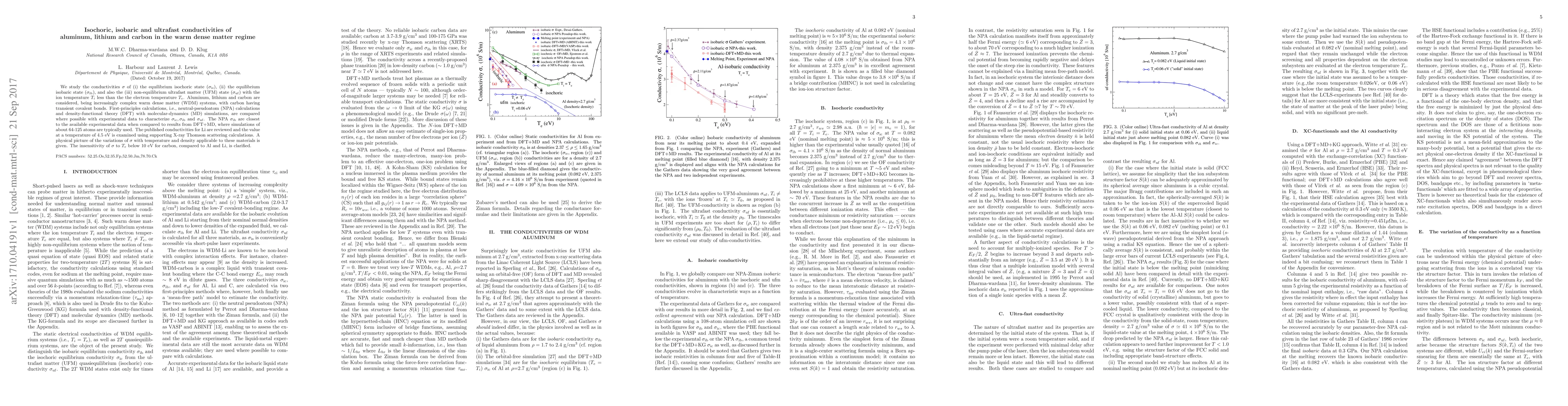 We study the conductivities $\sigma$ of (i) the equilibrium isochoric state ($\sigma_{\rm is}$), (ii) the equilibrium isobaric state ($\sigma_{\rm ib}$), and also the (iii) non-equilibrium ultrafast matter (UFM) state ($\sigma_{\rm uf}$) with the ion temperature $T_i$ less than the the electron temperature $T_e$. Aluminum, lithium and carbon are considered, being increasingly complex warm dense matter (WDM) systems, with carbon having transient covalent bonds. First-principles calculations, i.e., neutral-pseudoatom (NPA) calculations and density-functional theory (DFT) with molecular-dynamics (MD) simulations, are compared where possible with experimental data to characterize $\sigma_{\rm ic}, \sigma_{\rm ib}$ and $\sigma_{\rm uf}$. The NPA $\sigma_{\rm ib}$ are closest to the available experimental data when compared to results from DFT+MD, where simulations of about 64-125 atoms are typically used. The published conductivities for Li are reviewed and the value at a temperature of 4.5 eV is examined using supporting X-ray Thomson scattering calculations. A physical picture of the variations of $\sigma$ with temperature and density applicable to these materials is given. The insensitivity of $\sigma$ to $T_e$ below 10 eV for carbon, compared to Al and Li, is clarified.