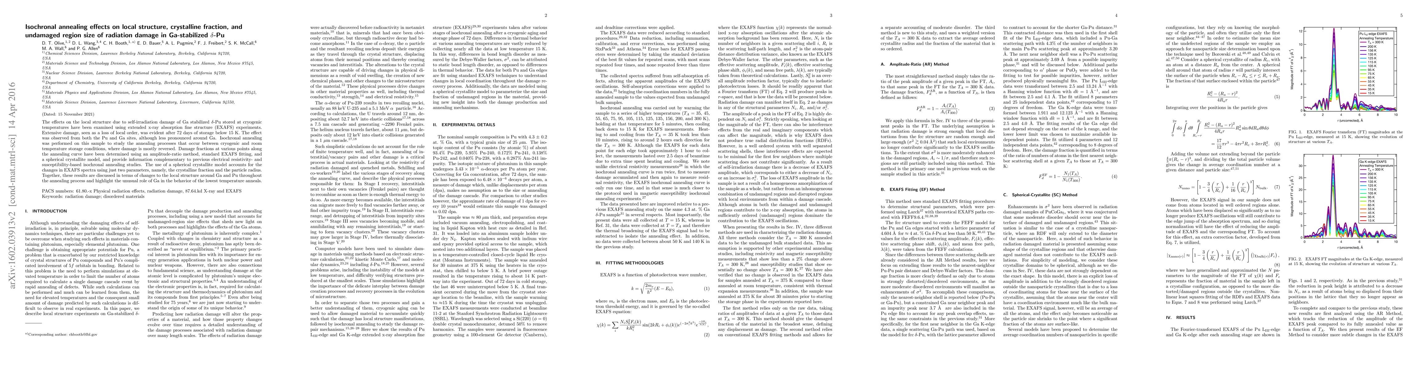 The effects on the local structure due to self-irradiation damage of Ga stabilized $\delta$-Pu stored at cryogenic temperatures have been examined using extended x-ray absorption fine structure (EXAFS) experiments. Extensive damage, seen as a loss of local order, was evident after 72 days of storage below 15 K. The effect was observed from both the Pu and Ga sites, although less pronounced around Ga. Isochronal annealing was performed on this sample to study the annealing processes that occur between cryogenic and room temperature storage conditions, where damage is mostly reversed. Damage fractions at various points along the annealing curve have been determined using an amplitude-ratio method, standard EXAFS fitting, and a spherical crystallite model, and provide information complementary to previous electrical resistivity- and susceptibility-based isochronal annealing studies. The use of a spherical crystallite model accounts for the changes in EXAFS spectra using just two parameters, namely, the crystalline fraction and the particle radius. Together, these results are discussed in terms of changes to the local structure around Ga and Pu throughout the annealing process and highlight the unusual role of Ga in the behavior of the lowest temperature anneals.